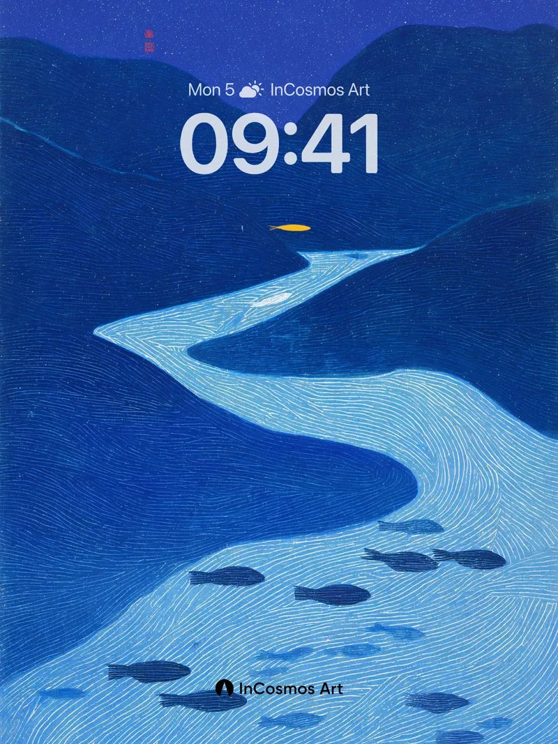 Debug product.metafields.custom.desc: Did you know that ancient Japanese woodblock artists used hand-carved blocks to create flowing lines like these? The river glows with a quiet pulse, its surface etched in delicate waves, while dark fish swim beneath a sky stitched with stars and a single golden moon. You’re not just looking at water—you’re floating through it, where silence hums and light breathes through the deep.