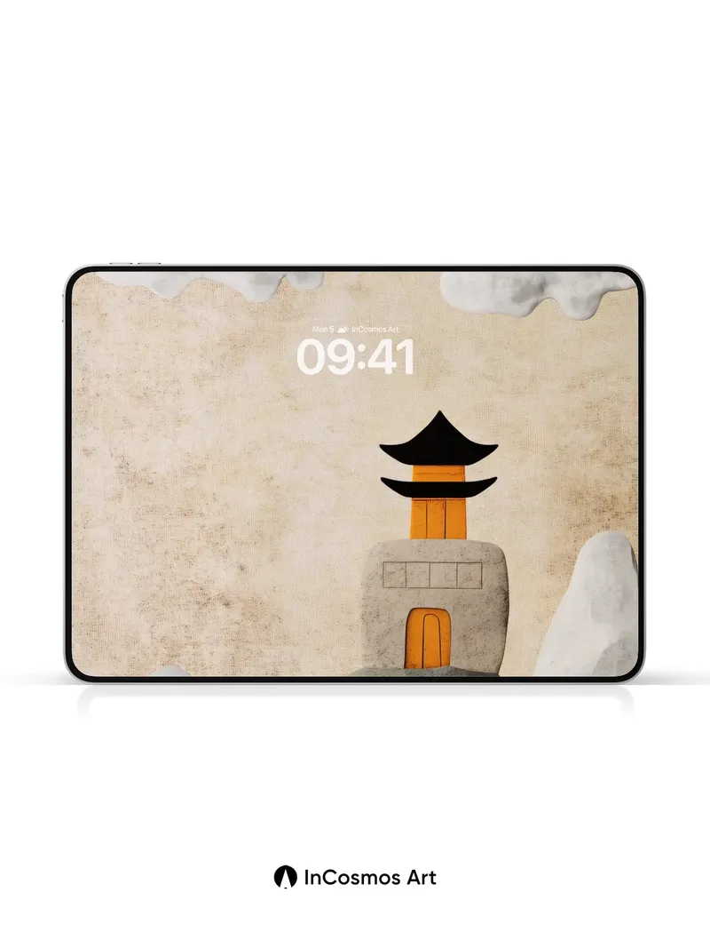 Debug product.metafields.custom.desc: Did you know ancient Chinese folklore speaks of rabbits pounding herbs on the moon? Here, two silent white bunnies sit atop jagged stone under a sun that glows like molten honey, their ears twitching in stillness. The pagoda rises like a whisper between mountains, its black roof curling into the sky like ink brushed across parchment—time suspended in paper and shadow.