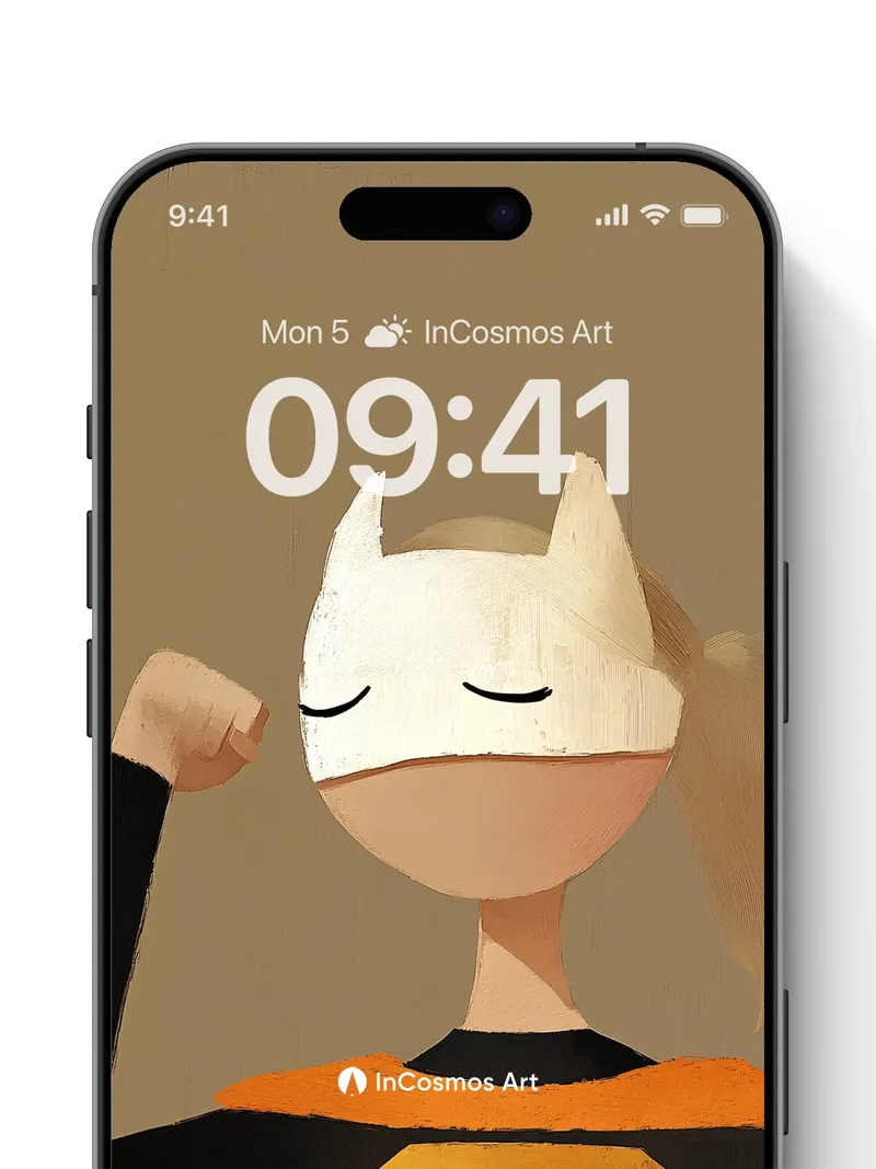 Debug product.metafields.custom.desc: Did you know that the texture of painted canvas can mimic the softness of skin under a quiet light? Here, a masked figure stands still, eyes gently closed, as if breathing in the calm before flight—her fist raised not in power, but in peace. The golden 'S' glows like a sun caught in fabric, and the mask’s smooth curve holds a silent promise: strength doesn’t need to shout.