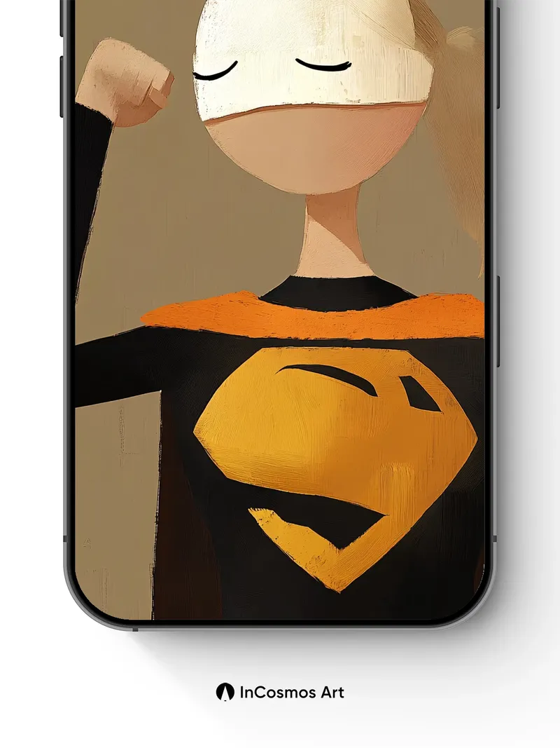 Debug page_description: Did you know that the texture of painted canvas can mimic the softness of skin under a quiet light? Here, a masked figure stands still, eyes gently closed, as if breathing in the calm before flight—her fist raised not in power, but in peace. The golden 'S' glows like a sun caught in fabric, and the mask’s smooth curve holds a silent promise: strength doesn’t need to shout. Share this with your best friend. Send this to your love and swap a matching set. What would you whisper to the superhero who never opens her eyes?