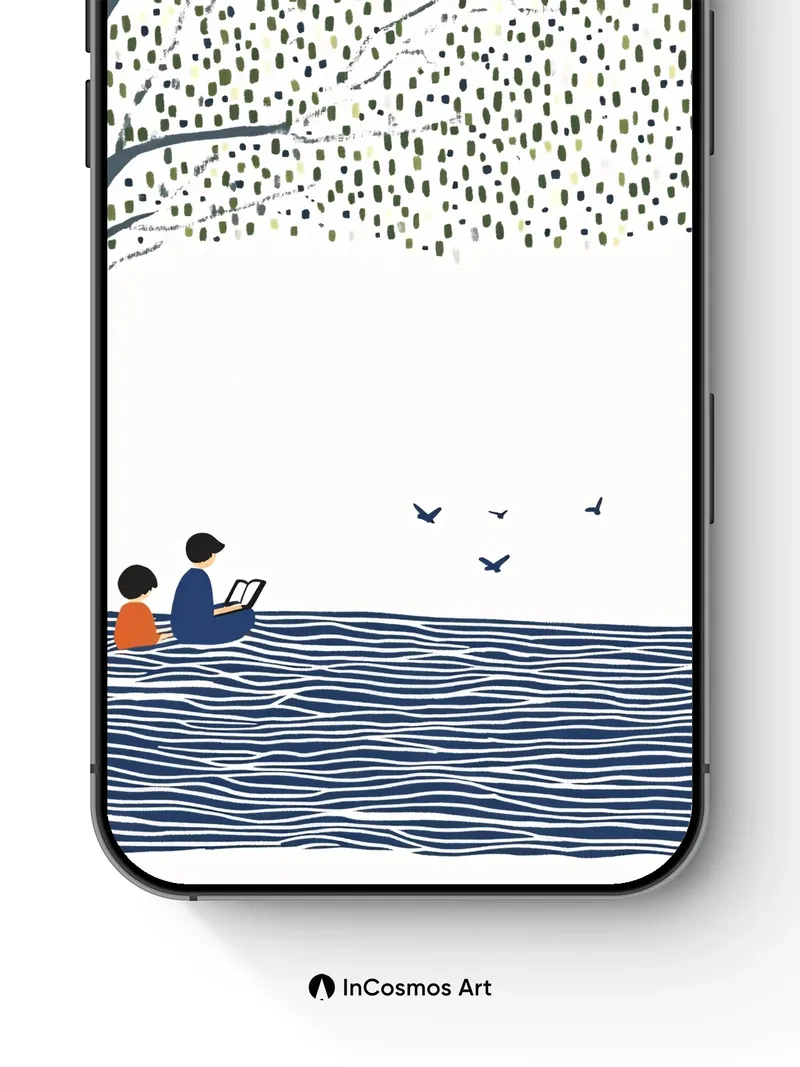Did you know that in Japanese tradition, reading under a cherry tree is believed to invite quiet wisdom? Here, two figures sit beneath a vast, dotted canopy where leaves fall like silent rain, their forms still against the deep blue waves of water below. The sky breathes soft white light through the branches, while three birds glide into the distance—each one a whisper of escape.