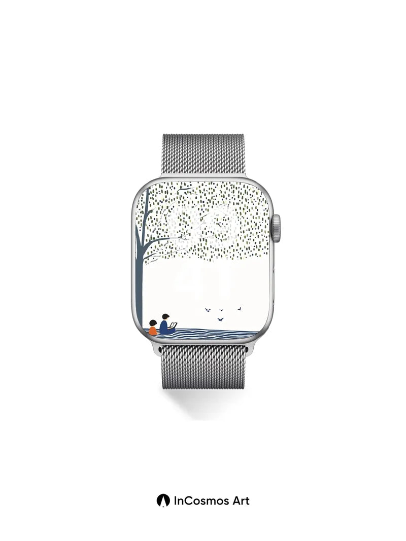 Debug page_description: Did you know that in Japanese tradition, reading under a cherry tree is believed to invite quiet wisdom? Here, two figures sit beneath a vast, dotted canopy where leaves fall like silent rain, their forms still against the deep blue waves of water below. The sky breathes soft white light through the branches, while three birds glide into the distance—each one a whisper of escape. Share this with your best friend. Send this to your love and swap a matching set. What if every page you read could grow its own tree?