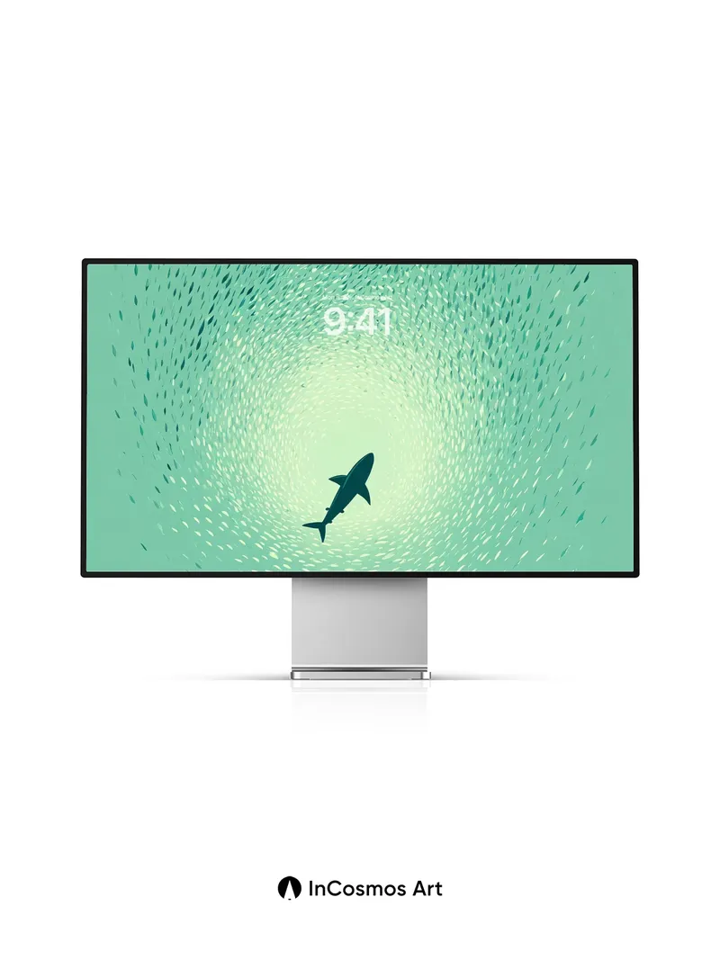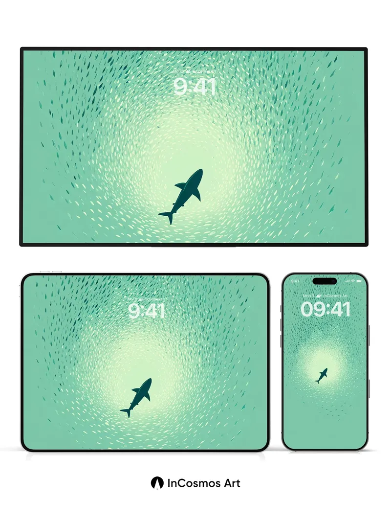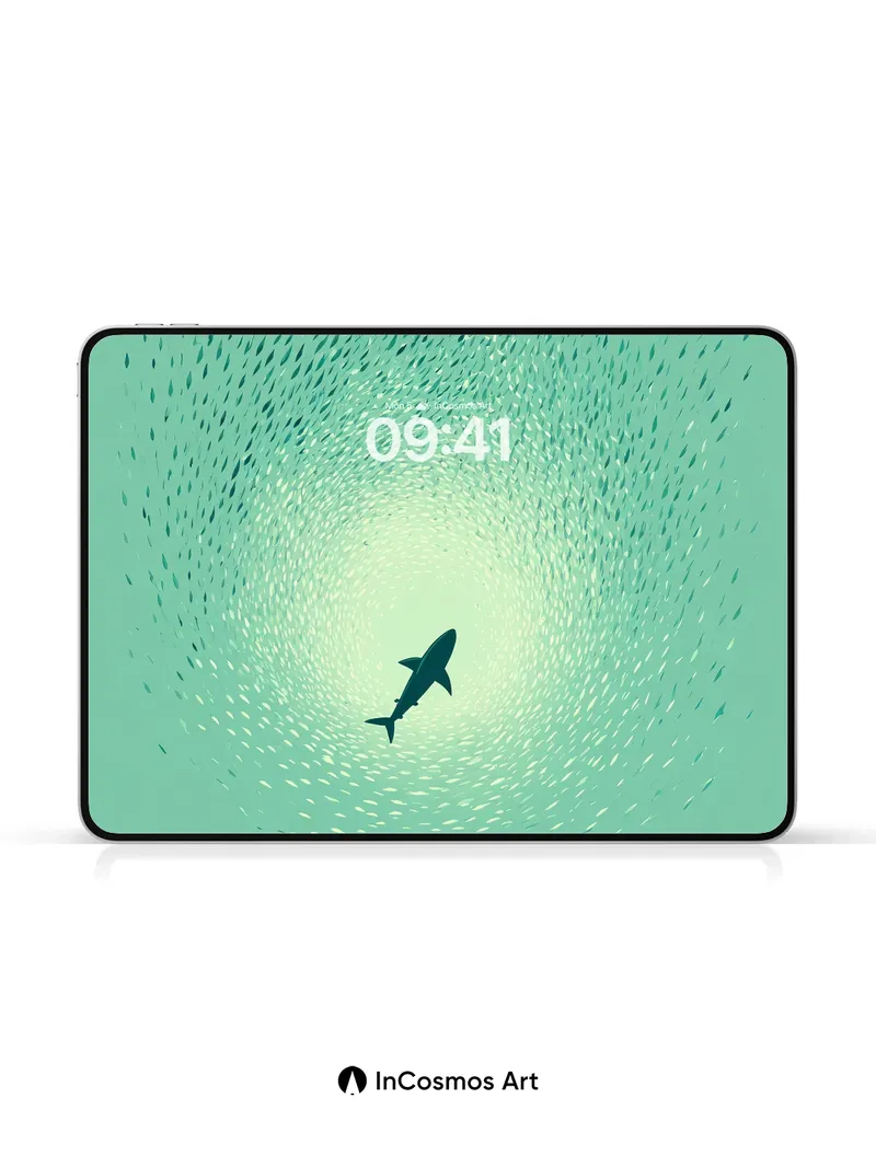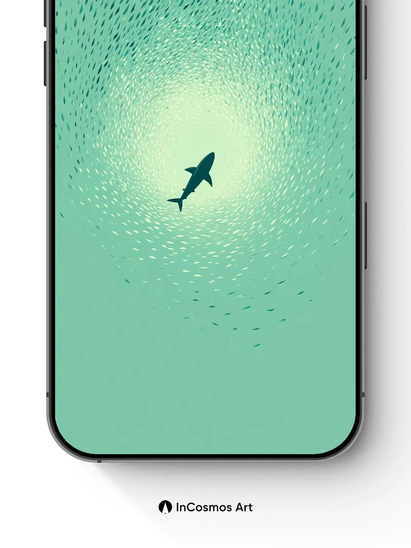 Debug page_description: A deep turquoise sea swirls into a soft, glowing center, framing a lone shark in quiet suspension. Did you know that sharks can sense electrical fields? It adds a silent tension to this calm scene. A deep turquoise sea swirls into a soft, glowing center, framing a lone shark in quiet suspension. Did you know that sharks can sense electrical fields? It adds a silent tension to this calm scene. Share this with your best friend. Send this to your love and swap a matching set. What does the silence of the deep feel like to you?