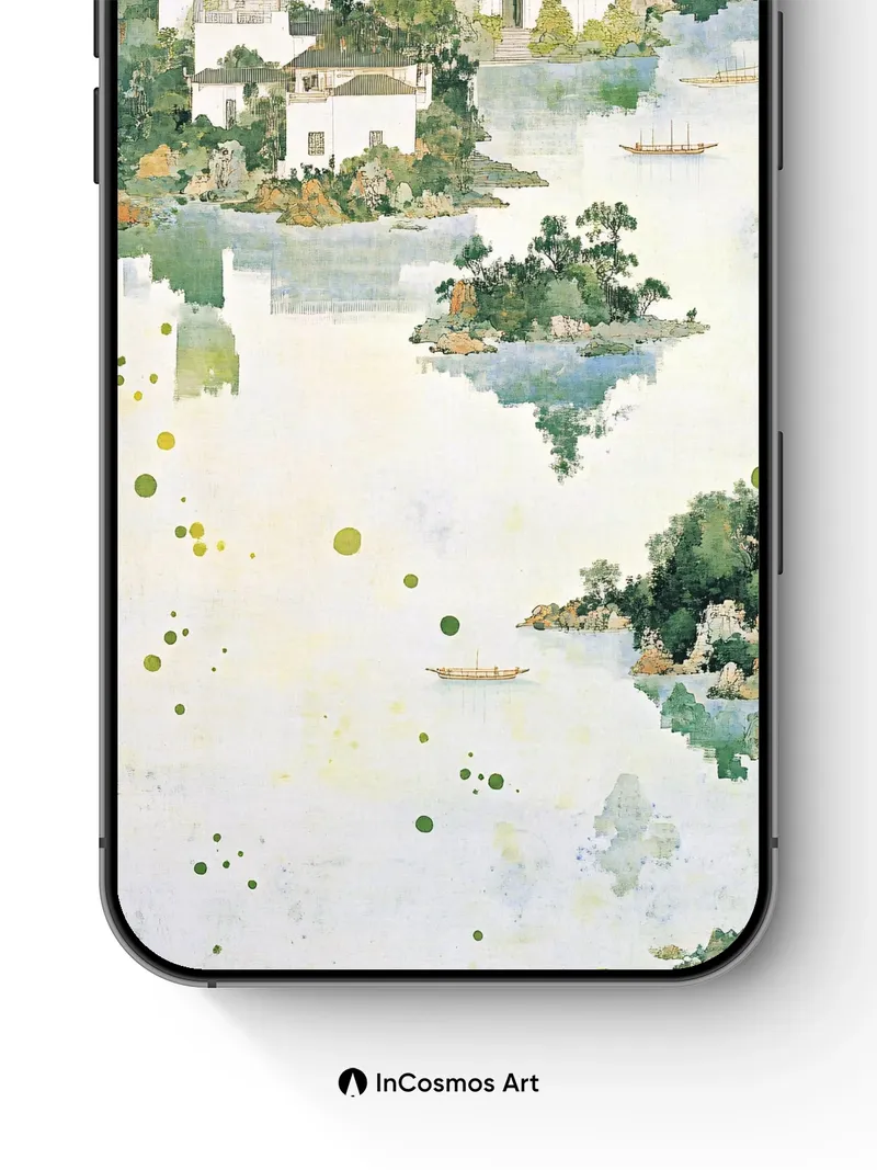 Debug page_description: Did you know traditional Chinese ink wash paintings often used water to create ethereal reflections, mimicking the soul’s quiet mirror? Here, pale jade mist drifts over whitewashed homes nestled in emerald hills, where boats glide like breath across still lakes and tiny islands float as if dreaming. The brushstrokes breathe life into every tree, each leaf a whisper of green against sky-bleached paper. Share this with your best friend. Send this to your love and swap a matching set. What if your walls could hold a memory of a place you’ve never been?