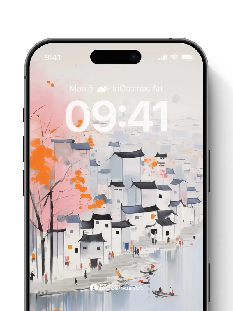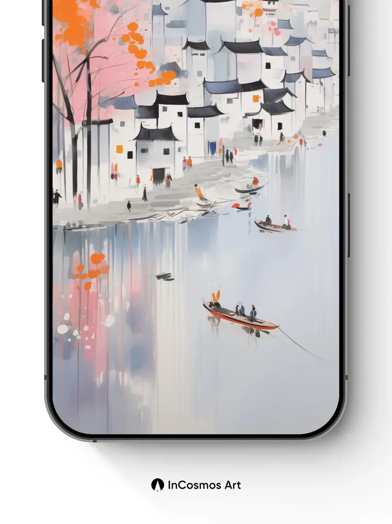 Did you know ink wash paintings once used rice paper to absorb water like breath? Here, mist curls over the river as if it’s exhaling memory, and autumn leaves float down like whispers from a forgotten season. The white-walled homes huddle close, their black roofs echoing in the still water, while boats glide without sound—each stroke of color a quiet heartbeat.