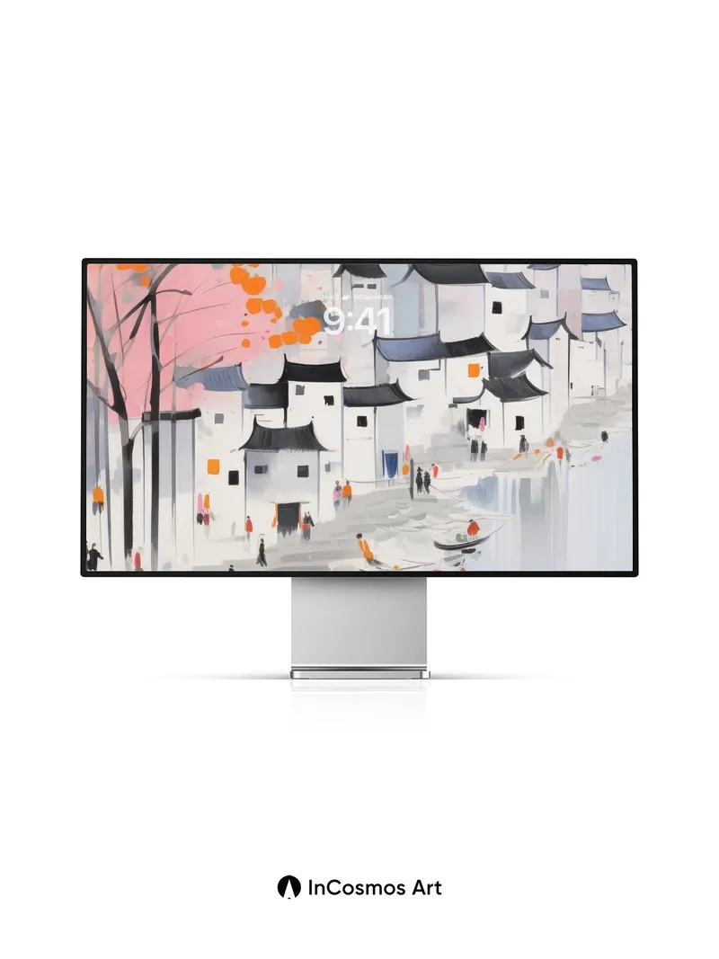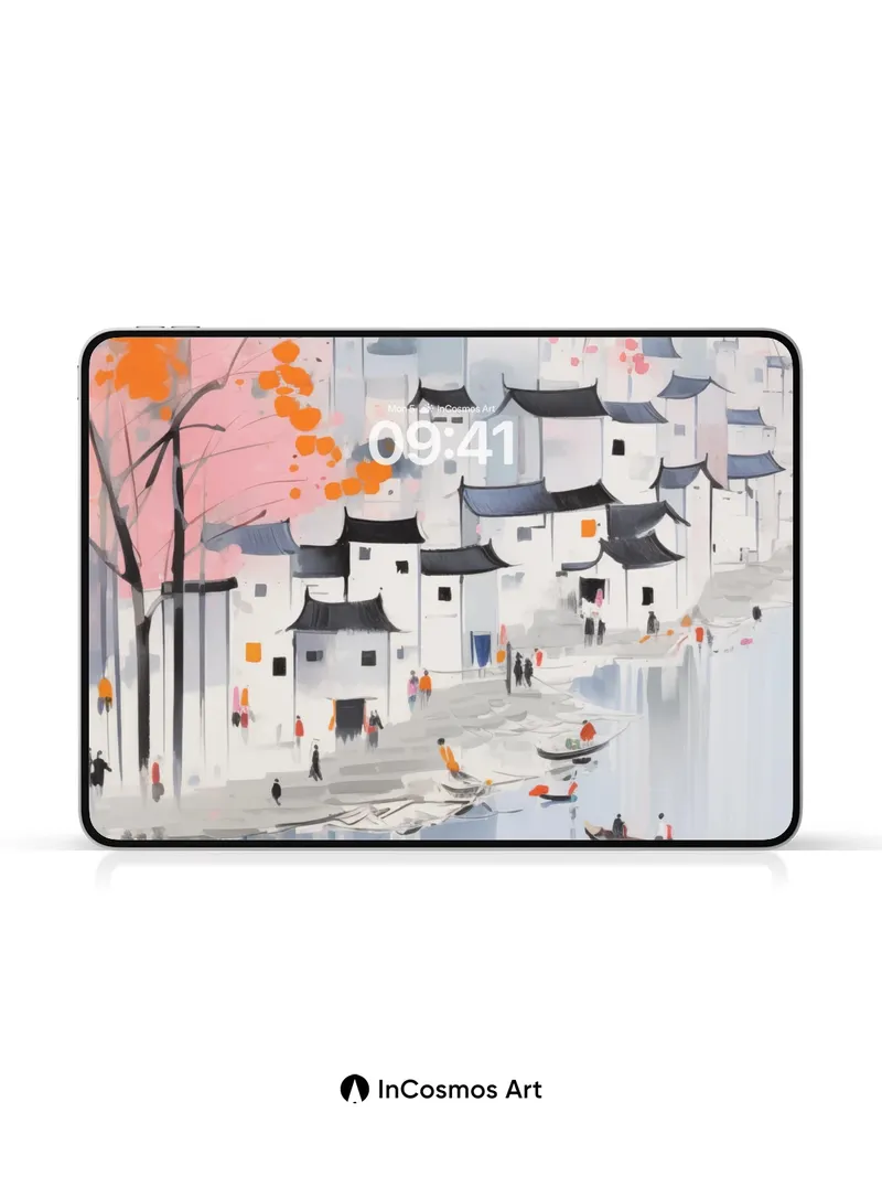 Debug product.metafields.custom.desc: Did you know ink wash paintings once used rice paper to absorb water like breath? Here, mist curls over the river as if it’s exhaling memory, and autumn leaves float down like whispers from a forgotten season. The white-walled homes huddle close, their black roofs echoing in the still water, while boats glide without sound—each stroke of color a quiet heartbeat.