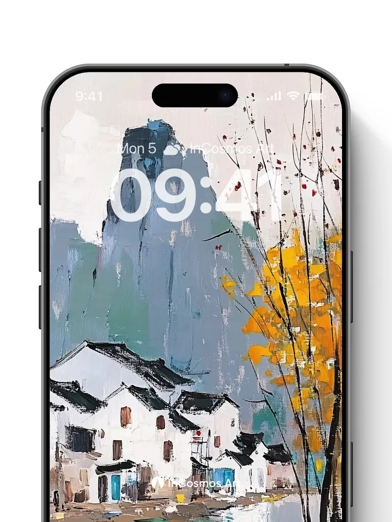 Debug page_description: Did you know the reflection of a mountain in still water can appear sharper than the mountain itself? Here, the ink-wash texture of distant peaks bleeds into turquoise ripples, while golden leaves tremble on bare branches like whispered secrets. A lone boat drifts across the mirror surface, its occupants cloaked in quiet purpose—time slows as color breathes through every brushstroke. Share this with your best friend. Send this to your love and swap a matching set. What if your home could remember the silence between waves?