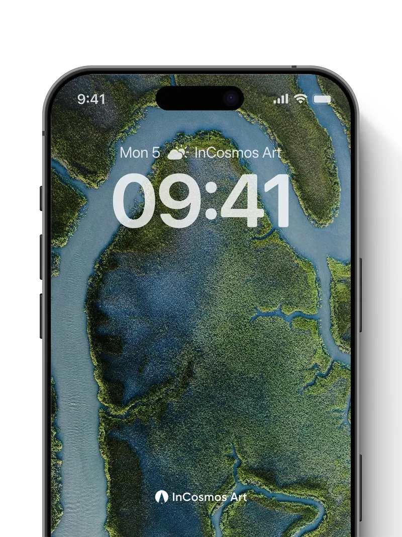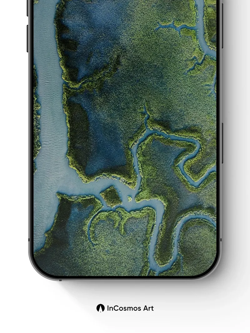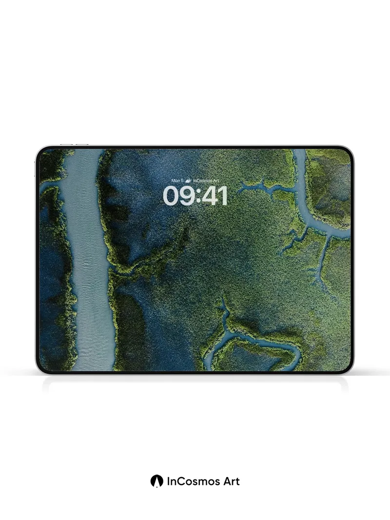 Debug product.metafields.custom.desc: Did you know marshlands breathe through their roots, exchanging gases in a quiet rhythm beneath the surface? Here, water carves slow serpentine paths through emerald hummocks, where algae cling like living lace and light filters through in soft, diffused veins. The blue channels shimmer with depth, while mossy banks pulse with a low, green warmth—like earth’s own circulatory system revealed from above.