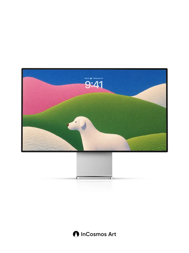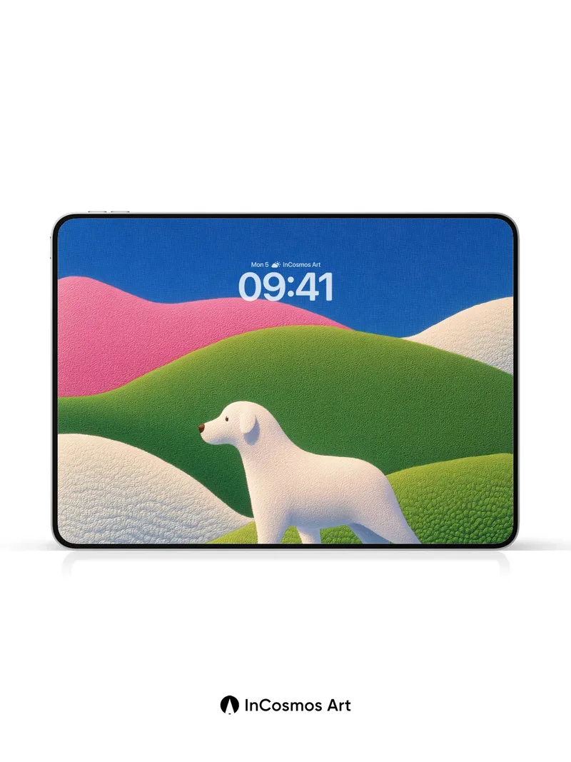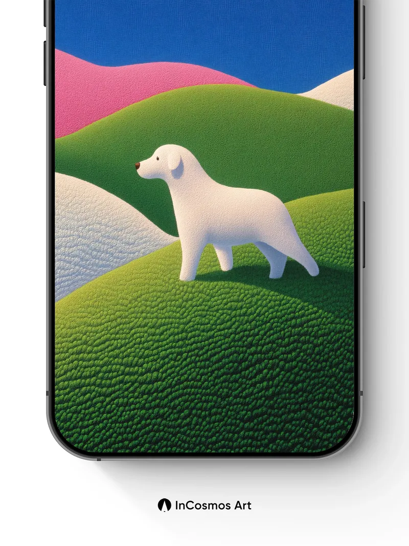 Debug product.metafields.custom.desc: Did you know the texture of these rolling hills mimics a soft, tactile surface like brushed velvet under morning light? The white dog stands still, yet its presence breathes quiet motion into the scene, as if time itself pauses to watch. The sky above is a deep, unbroken blue—so rich it feels like liquid glass—while the distant pink ridge glows like a memory just out of reach.