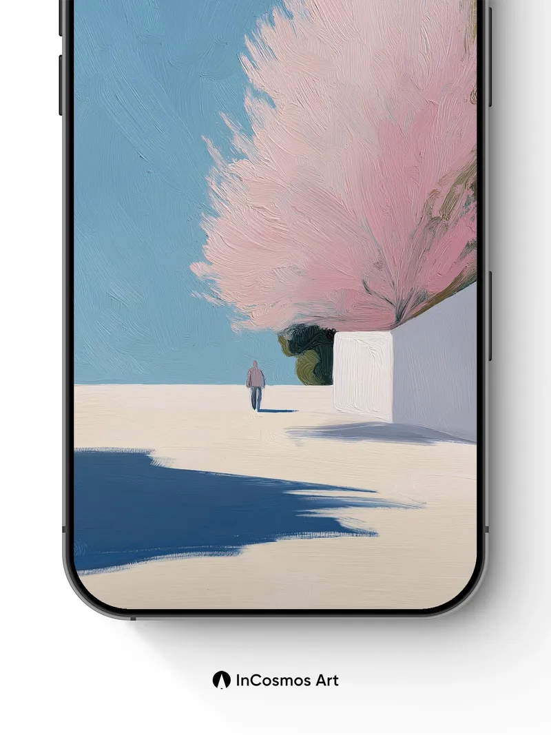 Debug product.metafields.custom.desc: Did you know cherry blossoms in Japan are celebrated not for their longevity, but for their fleeting beauty—each bloom lasting only a few days? Here, the tree’s soft pink crown hovers like a cloud above a lone figure walking beneath a vast sky, where light breathes across smooth stone and casts long, quiet shadows. The scene feels suspended between memory and dream, as if time itself has slowed to honor stillness.