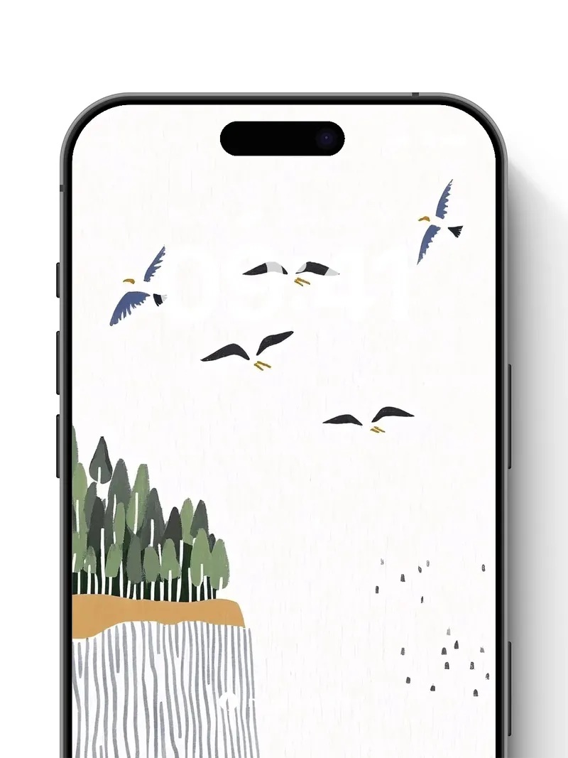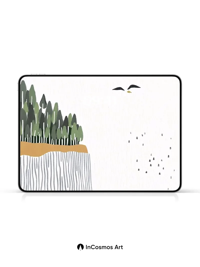 Debug page_description: Did you know geese fly in V-formations to reduce wind resistance, creating a rhythm that echoes across the sky? Here, their silhouettes trace paths above a striated cliff where pine trees stand like sentinels, their green crowns brushing the edge of stillness. The water below breathes in wavy patterns, each line a whisper of motion beneath a pale, textured sky. Share this with your best friend. Send this to your love and swap a matching set. What if silence had a shape?