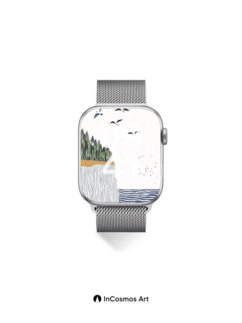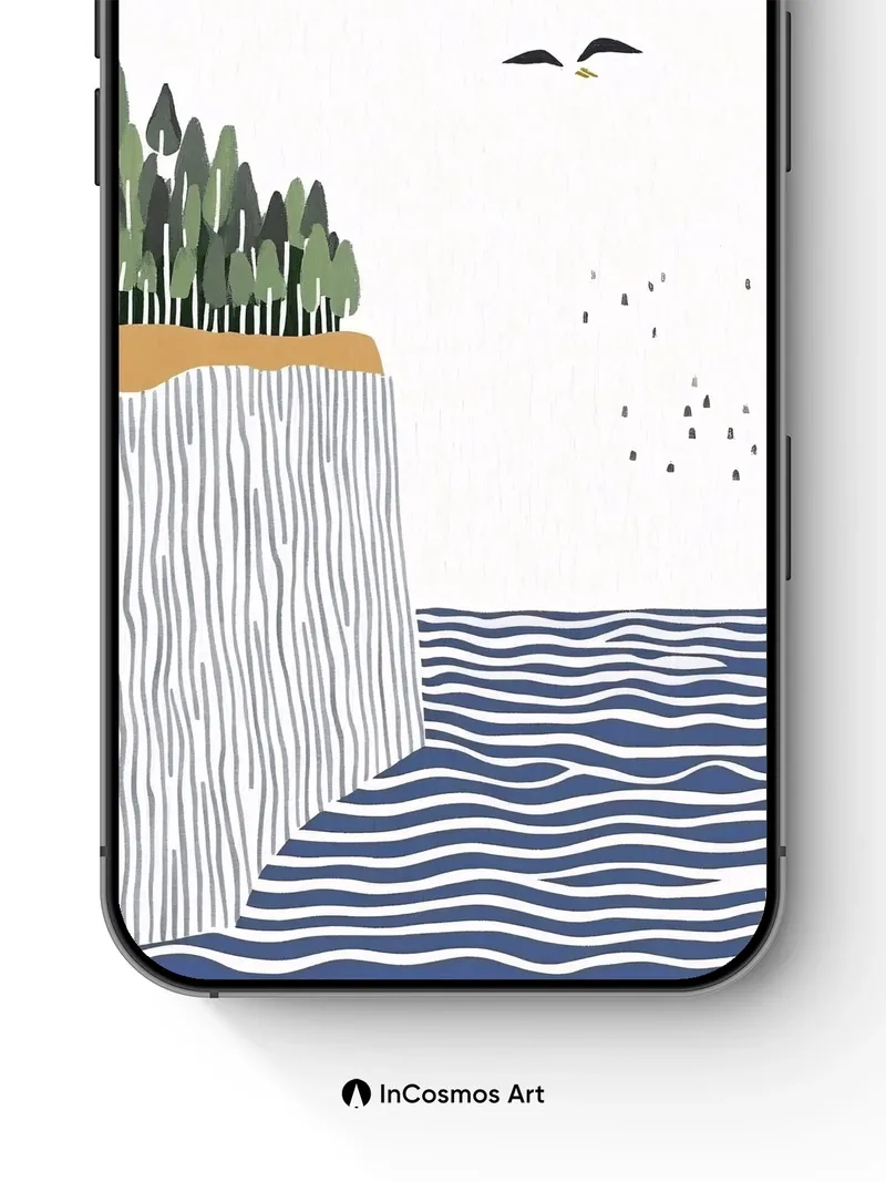 Debug product.metafields.custom.desc: Did you know geese fly in V-formations to reduce wind resistance, creating a rhythm that echoes across the sky? Here, their silhouettes trace paths above a striated cliff where pine trees stand like sentinels, their green crowns brushing the edge of stillness. The water below breathes in wavy patterns, each line a whisper of motion beneath a pale, textured sky.