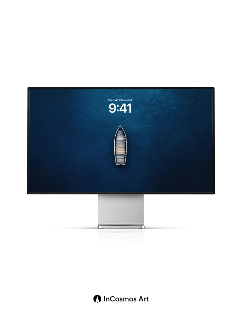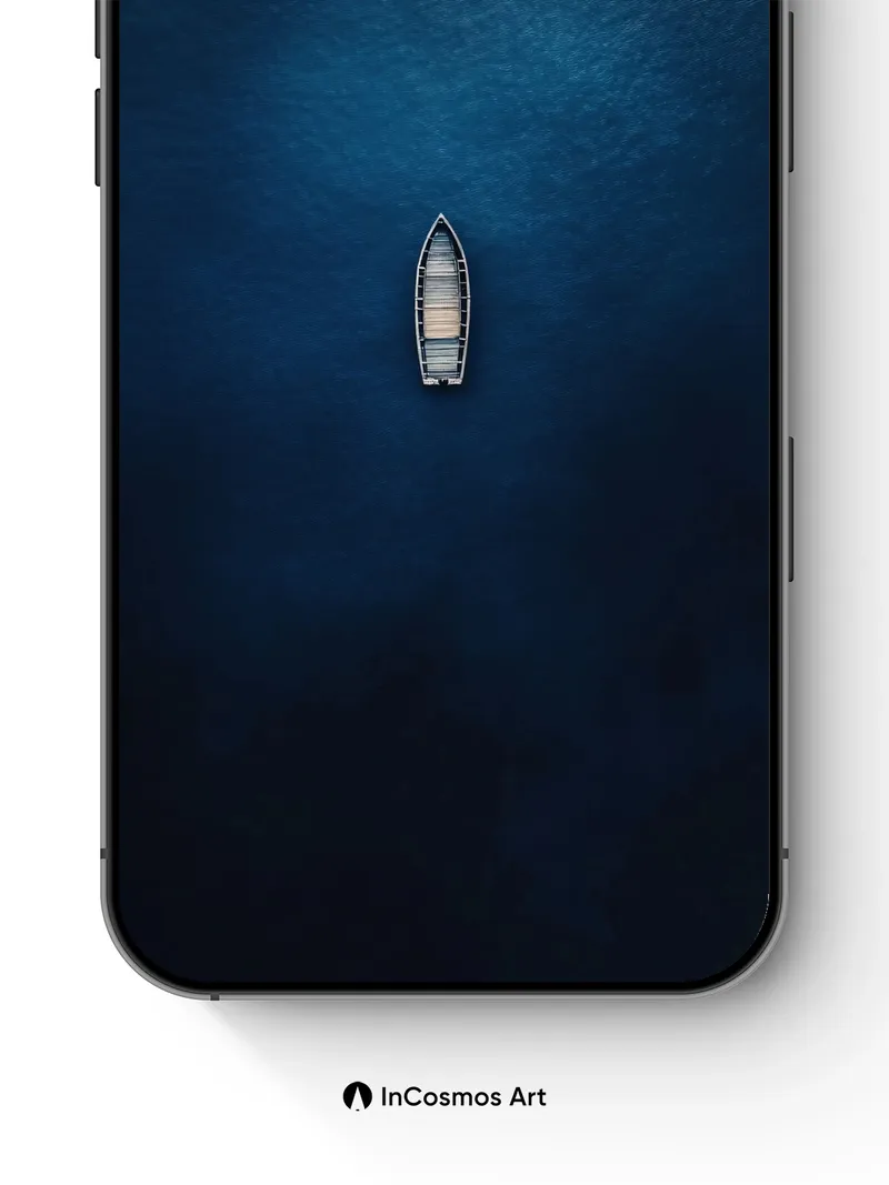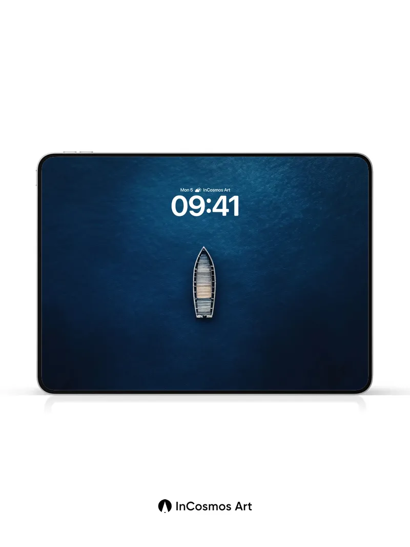 Debug product.metafields.custom.desc: Did you know the deepest ocean trenches reflect light like a mirror under moonlight? This image captures a lone wooden boat floating on an endless expanse of dark blue water, where the surface breathes with subtle ripples and shadows that crawl like whispers across the abyss. The vessel, centered and still, becomes a quiet witness to the vastness, its weathered hull glowing faintly beneath the dim sky.