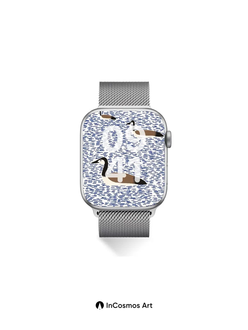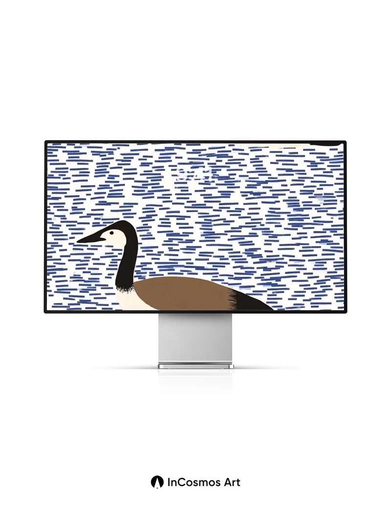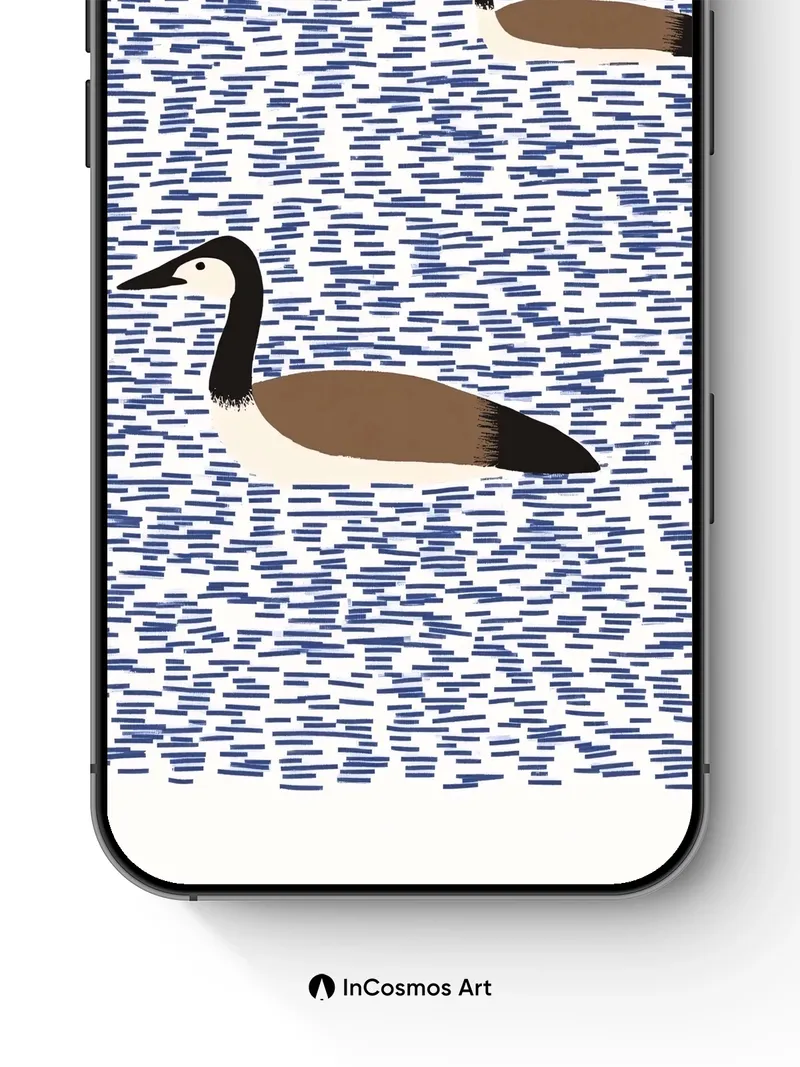 Debug product.metafields.custom.desc: Did you know Canada geese can sleep with one half of their brain awake? Here, three silent figures glide over a sea of hand-drawn blue dashes that breathe like water under wind. Each stroke pulses with quiet motion, mimicking the surface’s gentle undulation. The ducks float not as subjects but as echoes—still, aware, part of the rhythm. Their forms are clean and bold, yet softened by the surrounding texture, like ink floating on rain-slicked paper.