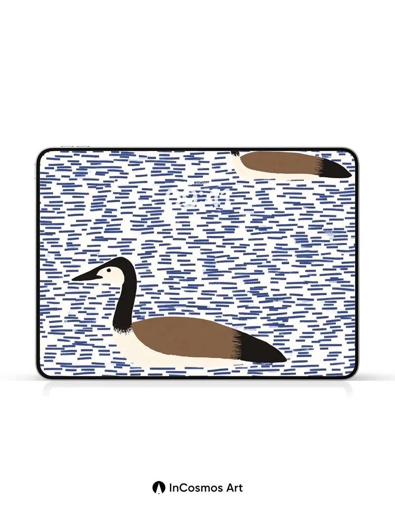 Debug page_description: Did you know Canada geese can sleep with one half of their brain awake? Here, three silent figures glide over a sea of hand-drawn blue dashes that breathe like water under wind. Each stroke pulses with quiet motion, mimicking the surface’s gentle undulation. The ducks float not as subjects but as echoes—still, aware, part of the rhythm. Their forms are clean and bold, yet softened by the surrounding texture, like ink floating on rain-slicked paper. Share this with your best friend. Send this to your love and swap a matching set. What if stillness could speak in waves?