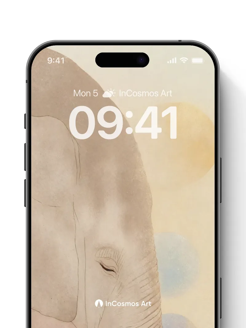 Debug product.metafields.custom.desc: Did you know elephants communicate through low-frequency rumbles that travel miles underground? Here, a soft brushstroke of earth-toned skin meets the delicate curve of a tiny white calf, their trunks brushing like whispered secrets. Light breathes through the parchment-like surface, where golden orbs float like distant suns, and the air feels still enough to hold a heartbeat.