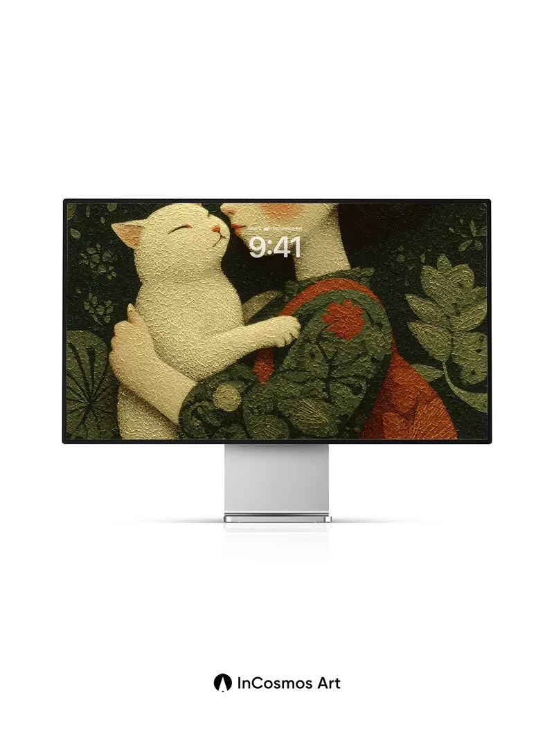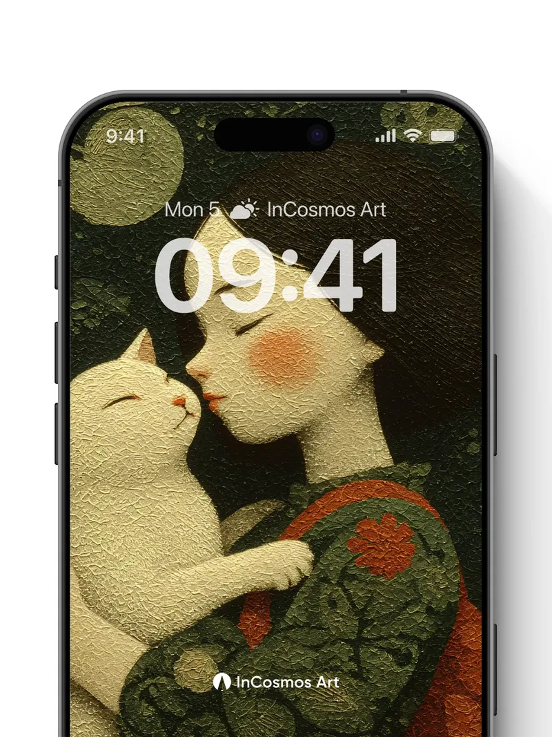 Debug product.metafields.custom.desc: Did you know that in traditional Japanese art, cats are often seen as guardians of the soul? Here, a woman cradles a white cat like a sacred relic, their faces close in quiet communion. The texture of her kimono feels like hand-embroidered silk, each thread catching light like a whispered secret. Behind them, floral patterns bloom in muted golds and deep greens, as if the garden itself is breathing.