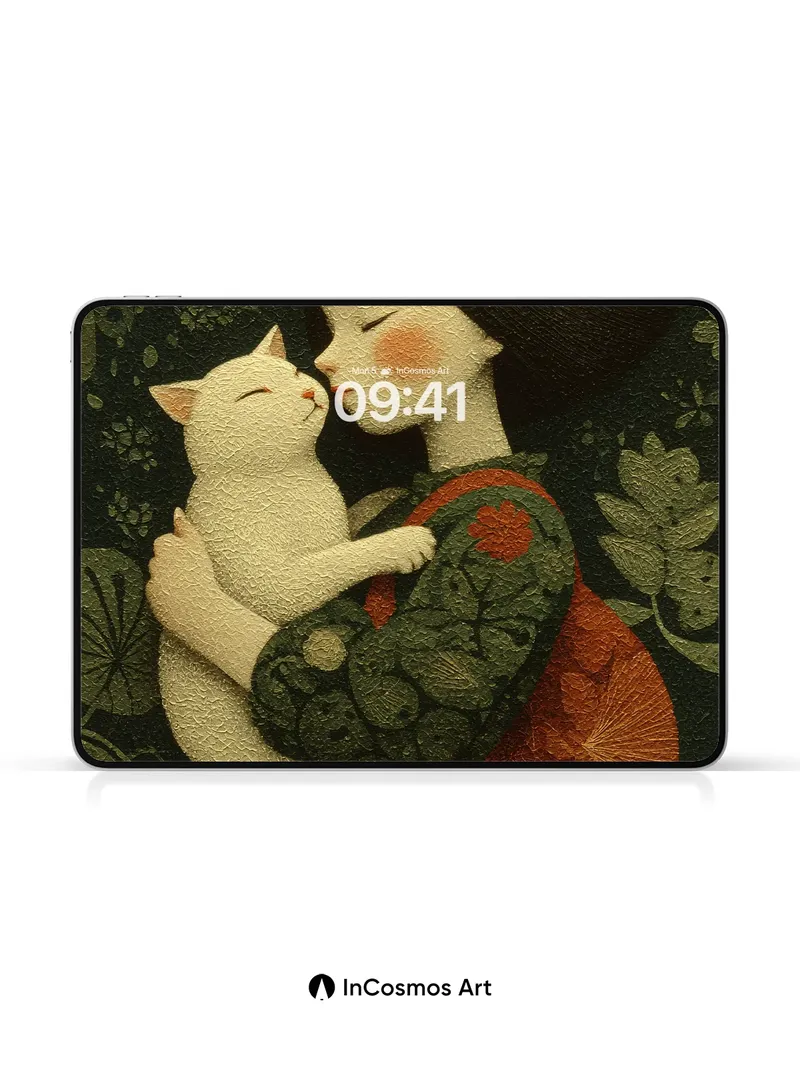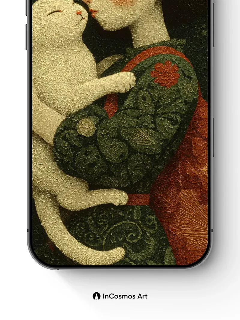 Debug page_description: Did you know that in traditional Japanese art, cats are often seen as guardians of the soul? Here, a woman cradles a white cat like a sacred relic, their faces close in quiet communion. The texture of her kimono feels like hand-embroidered silk, each thread catching light like a whispered secret. Behind them, floral patterns bloom in muted golds and deep greens, as if the garden itself is breathing. Share this with your best friend. Send this to your love and swap a matching set. What if every touch between humans and animals held a memory from another life?