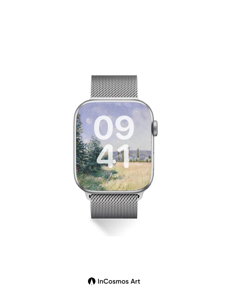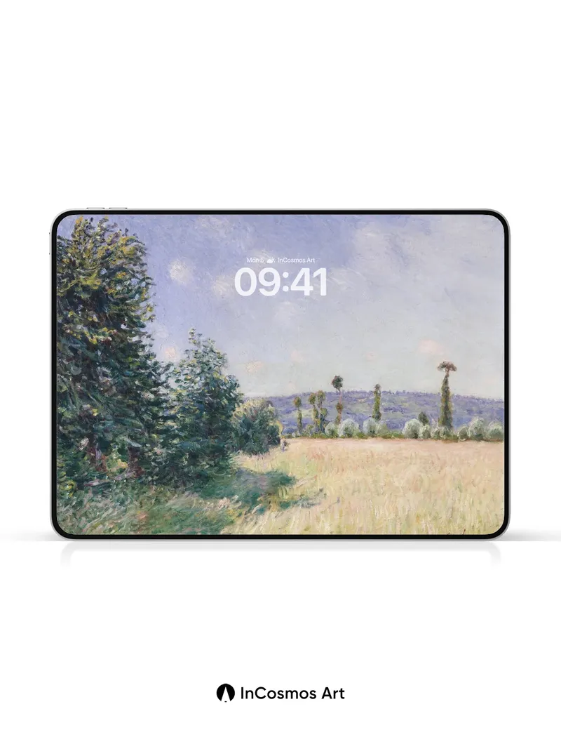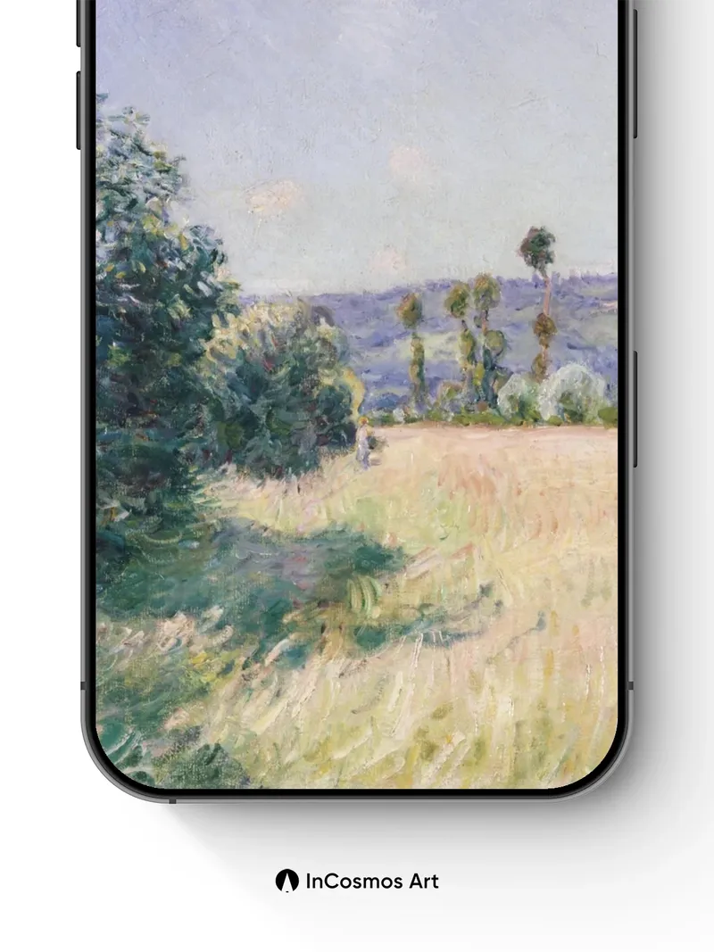 Debug page_description: Did you know Impressionist painters often worked en plein air to capture fleeting light? Here, sunlight breathes through golden wheat, brushing the edges of olive trees like a warm hand. The sky hums with soft lavender and cloud-streaked blue, while distant cypress spires rise like quiet sentinels. This scene feels less like a painting and more like a memory held just beyond recall—peaceful, sun-drenched, and alive. Share this with your best friend. Send this to your love and swap a matching set. What if every morning began with this kind of stillness?