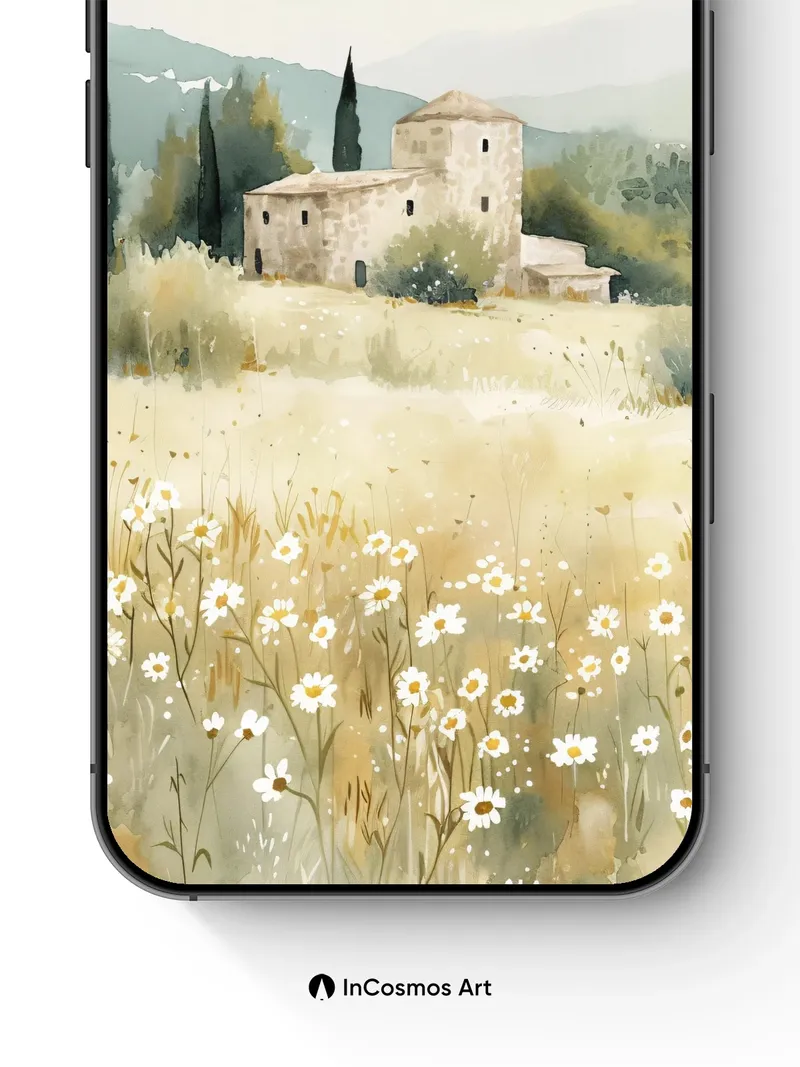 Did you know that daisies once symbolized innocence in medieval herbals? Here, they sway in golden light like whispers across sunbaked earth, their petals catching the hush of a forgotten hour. A weathered stone house stands still, its walls breathing centuries of quiet, while distant hills fade into soft mist—time slows, and every blade of grass holds a secret.
