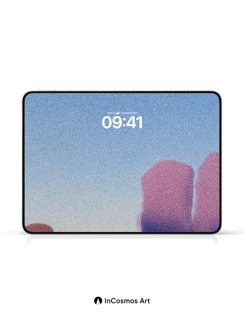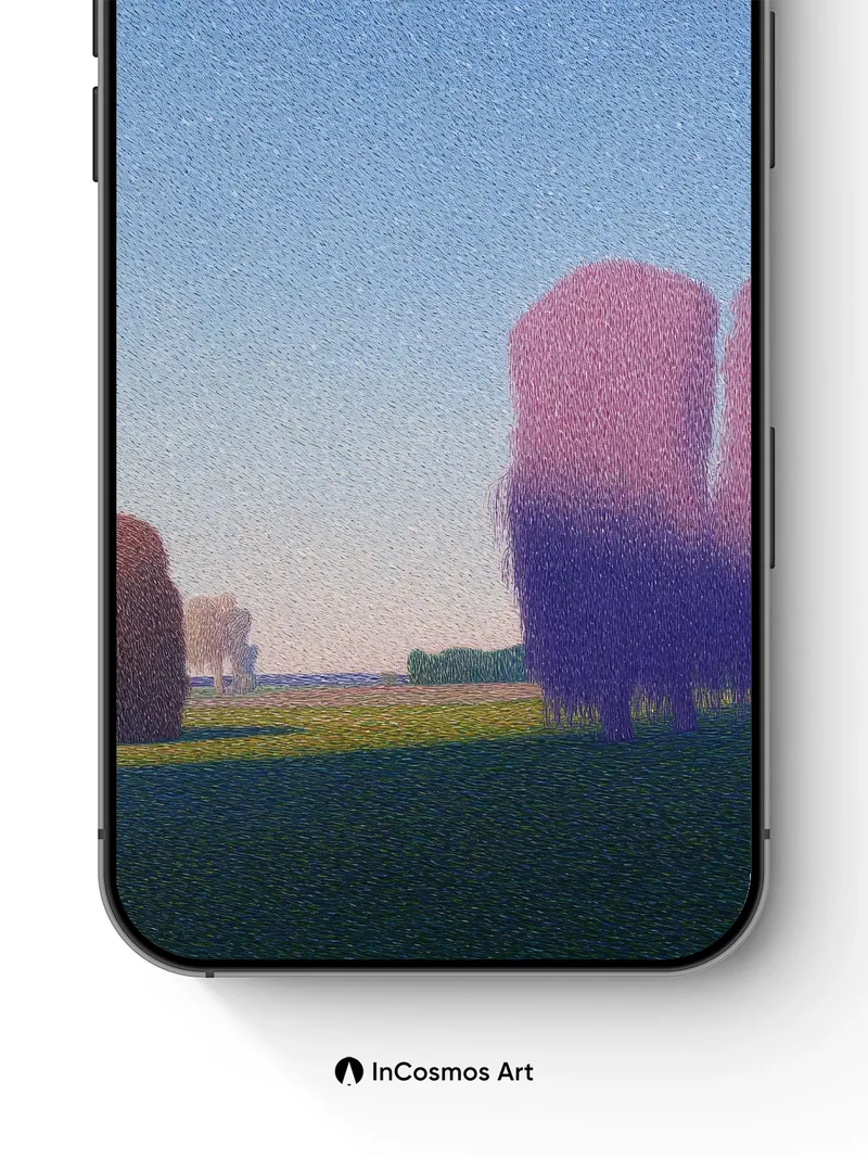 Debug product.metafields.custom.desc: Did you know that trees communicate through underground fungal networks, sharing nutrients and warnings like silent poets beneath the soil? Here, their forms blur into soft violet silhouettes against a sky that breathes from cerulean to dawn-hush, as if time itself has paused to listen. The grass glows with a quiet luminescence, each blade etched in fine detail, while distant hills dissolve into hazy memory.