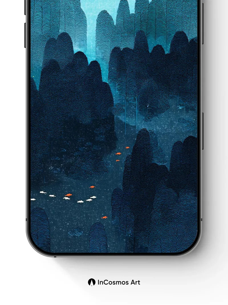Did you know that in traditional Japanese art, koi fish symbolize perseverance and strength? Here, they glide through a misty, ink-washed forest where trees rise like ancient sentinels, their layered forms breathing depth into the cool turquoise sky. Light doesn’t fall—it sinks slowly into the shadows, as if time itself is holding its breath beneath the canopy.