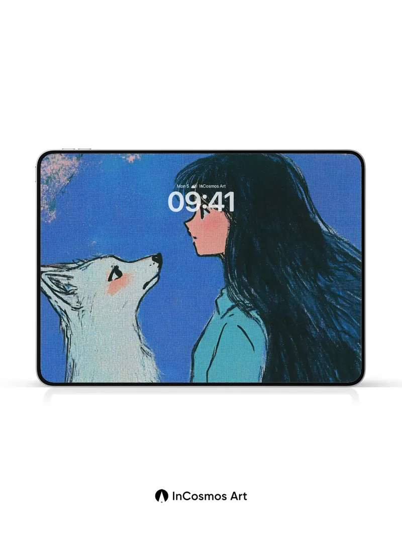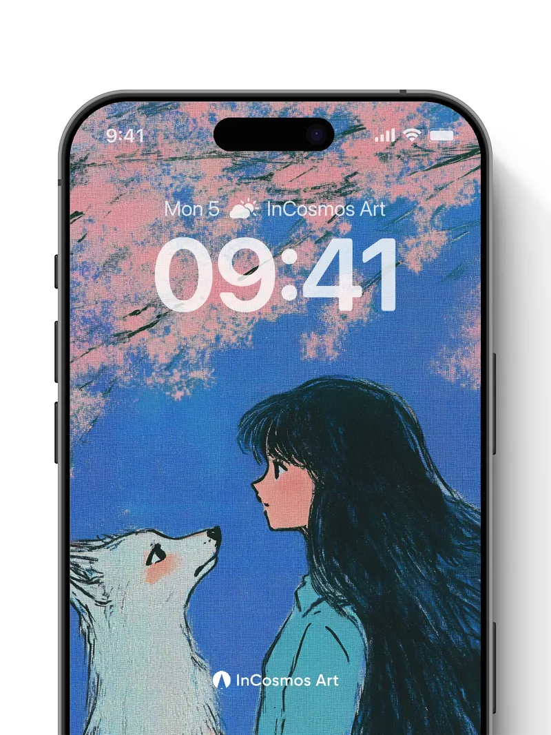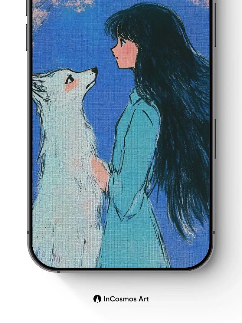 Debug product.metafields.custom.desc: Did you know cherry blossoms in Japan are believed to carry spirits of ancestors? Here, soft pink petals drift like whispers through a twilight sky, brushing against the cool blue of an endless evening. A girl with ink-black hair stands still, her hand resting gently on a white fox whose eyes hold the quiet wisdom of ancient forests—both gazing into each other’s souls beneath a canopy that feels alive with memory and breath.