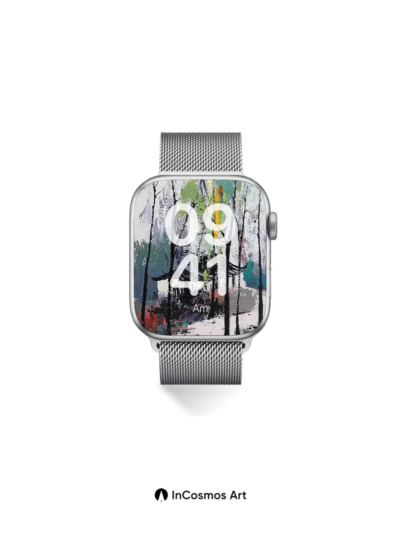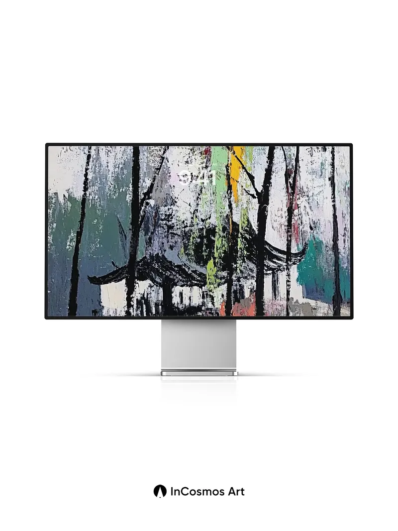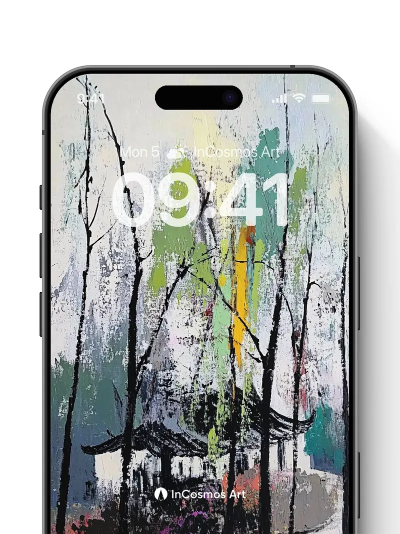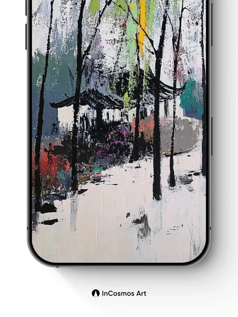Debug product.metafields.custom.desc: Did you know traditional East Asian ink wash paintings used only black ink to create depth through tonal variation? Here, the trees rise like silent sentinels, their bare branches etched in bold strokes against a sky that breathes soft hues of jade and ochre. The pavilion nestled beneath them feels both ancient and timeless, its curved roof echoing the gentle arc of nature’s rhythm.