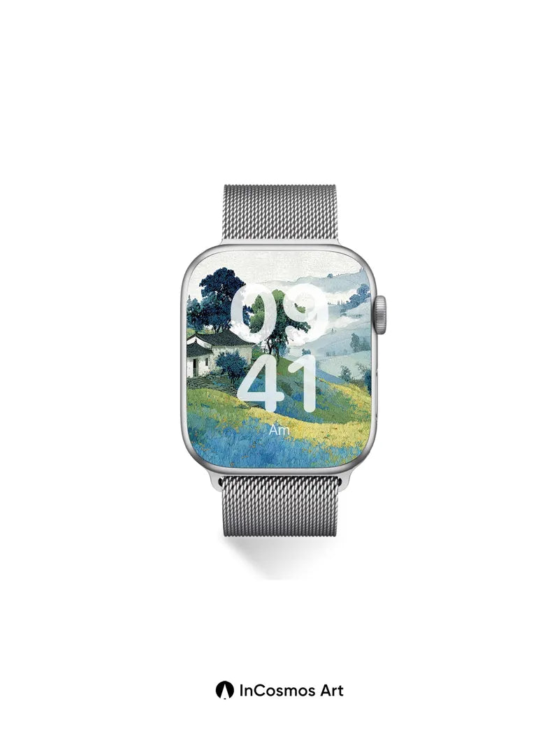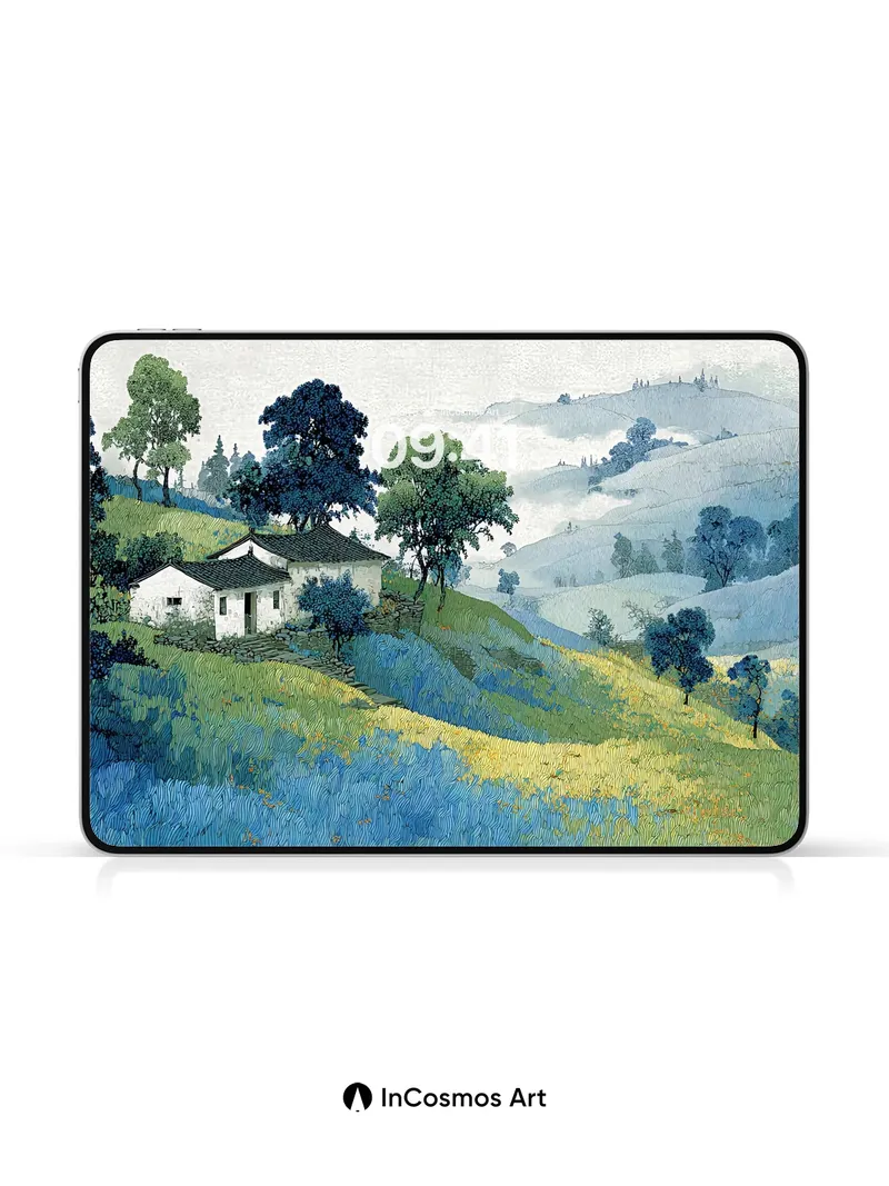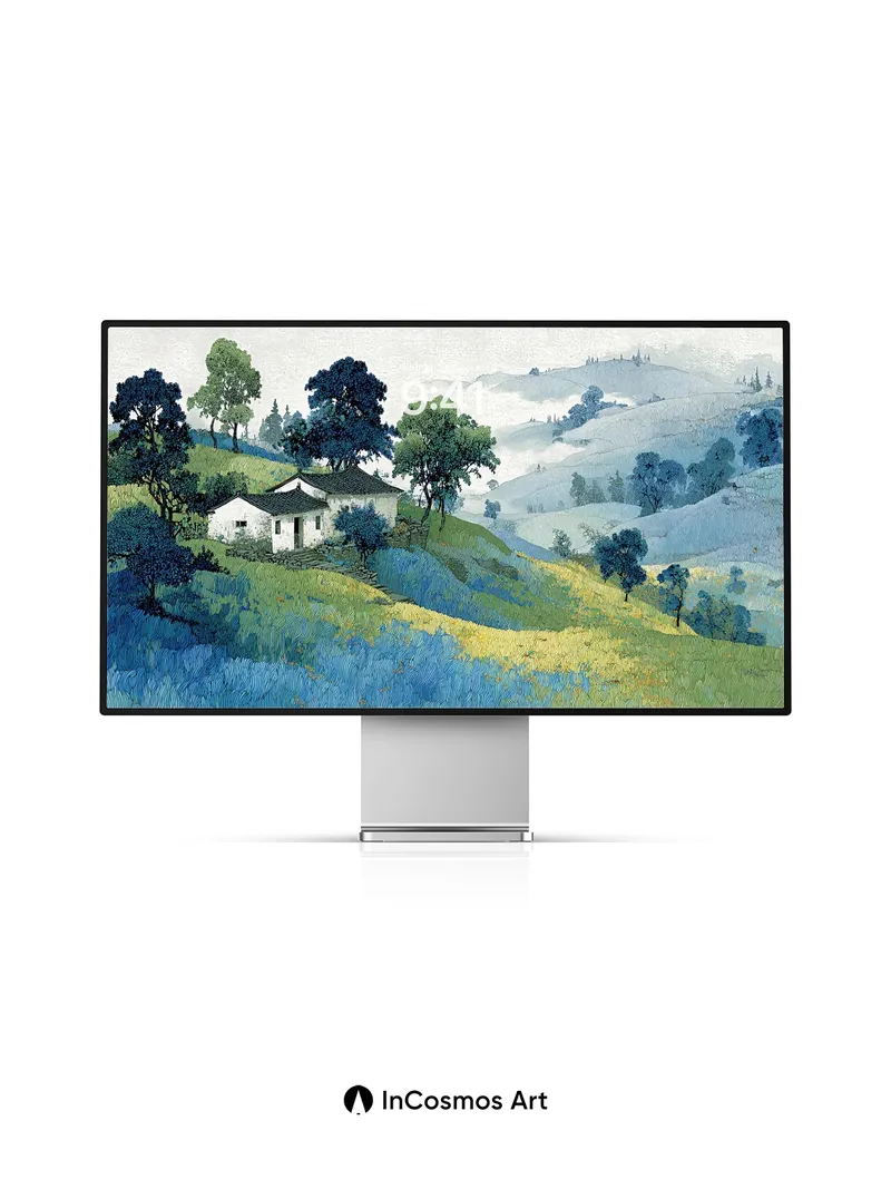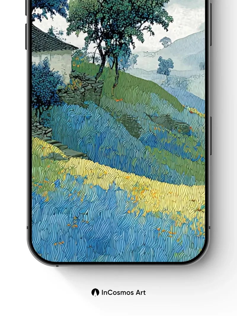 Debug product.metafields.custom.desc: Did you know that the softest light in nature often arrives just before dawn, when shadows still hold their breath? This scene unfolds like a watercolor dream—rolling hills draped in blue haze, a lone white cottage nestled among deep green trees, and wildflowers painted in strokes of gold and cobalt. The air feels cool against your skin, as if the landscape itself is exhaling quiet peace.
