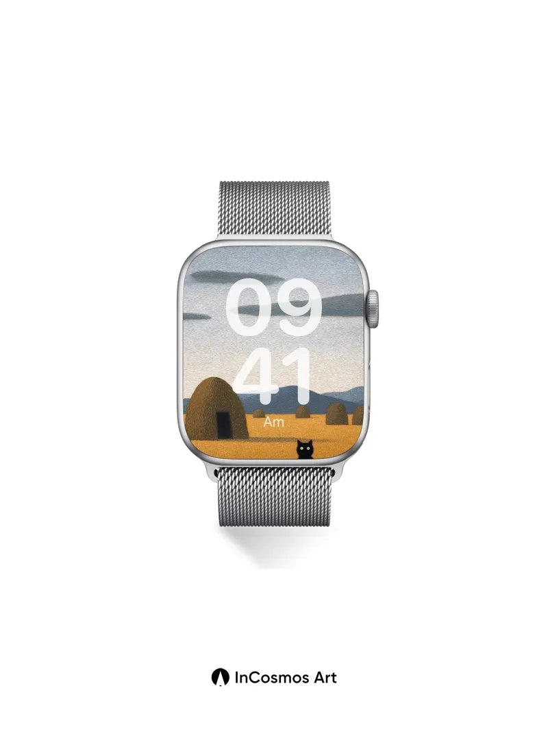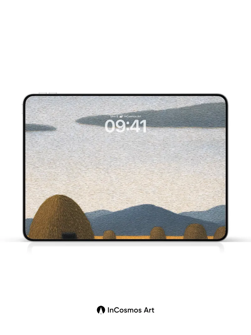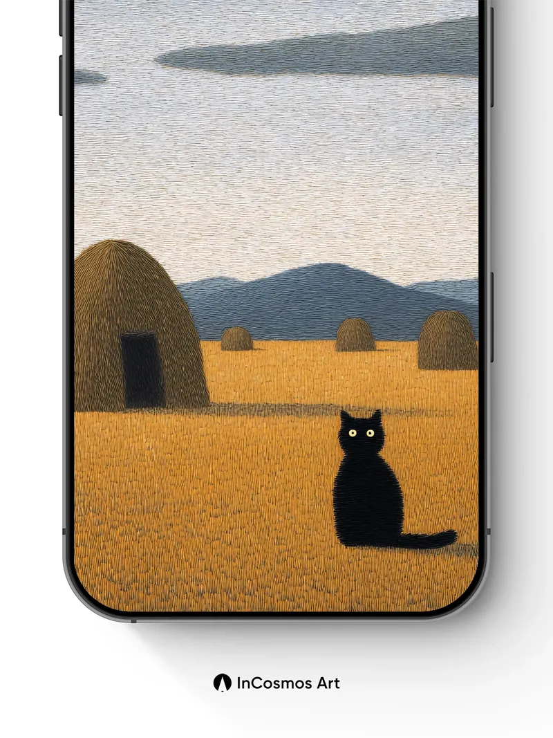 Serenity in Haystack Fields Wallpaper with Watchful Cat