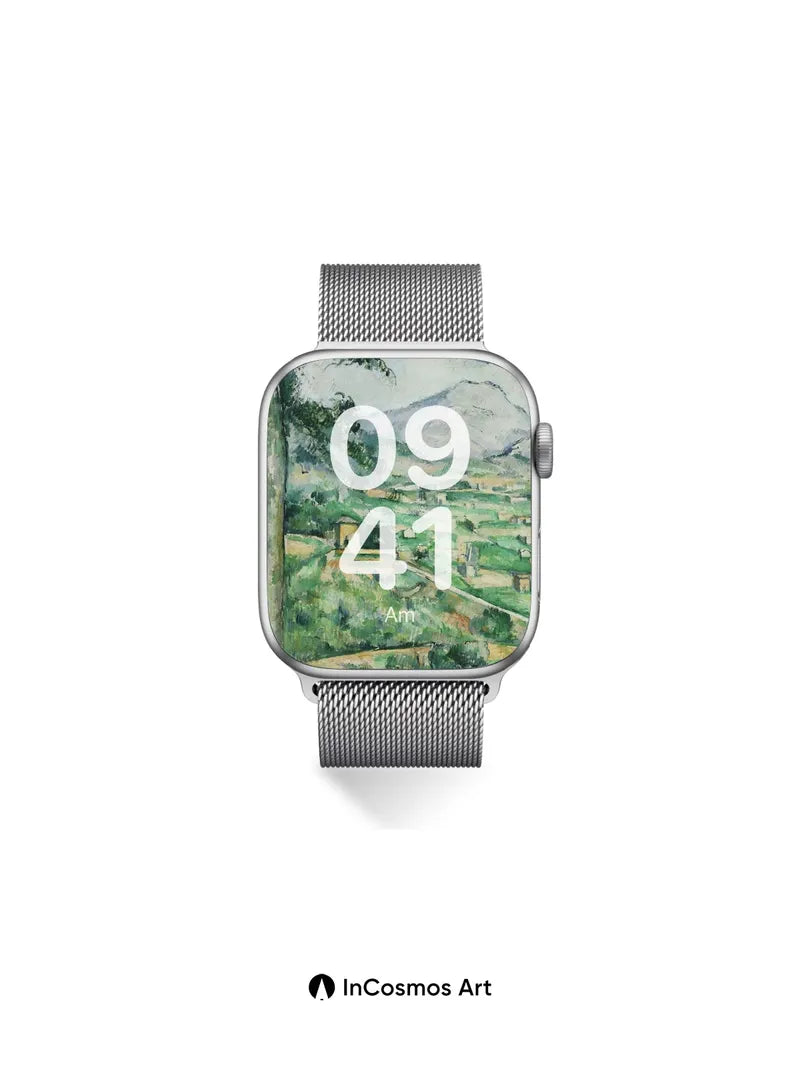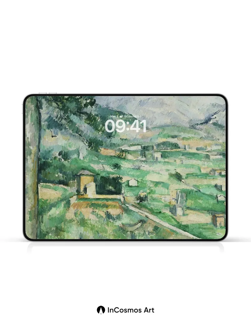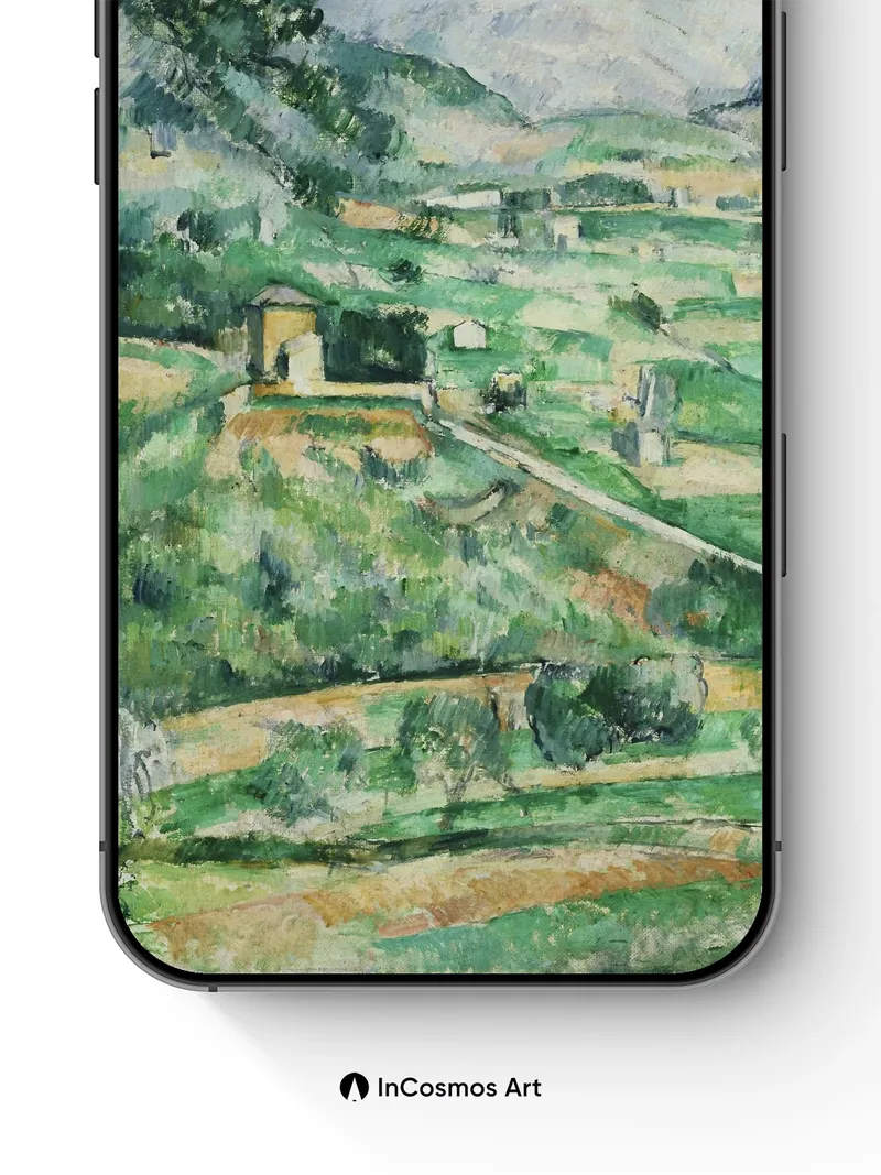 Debug page_description: Did you know Cézanne once said, 'I want to make of Impressionism something solid and lasting like the art of the museums?' Here, light breathes through thick impasto strokes, where olive groves climb terraced hills under a sky brushed with soft ash-gray clouds. The distant mountain looms not as a peak but as a dream held in place by green fields and scattered stone huts — a landscape that feels both ancient and eternal. Share this with your best friend. Send this to your love and swap a matching set. What if every wall could whisper the quiet of Provence?