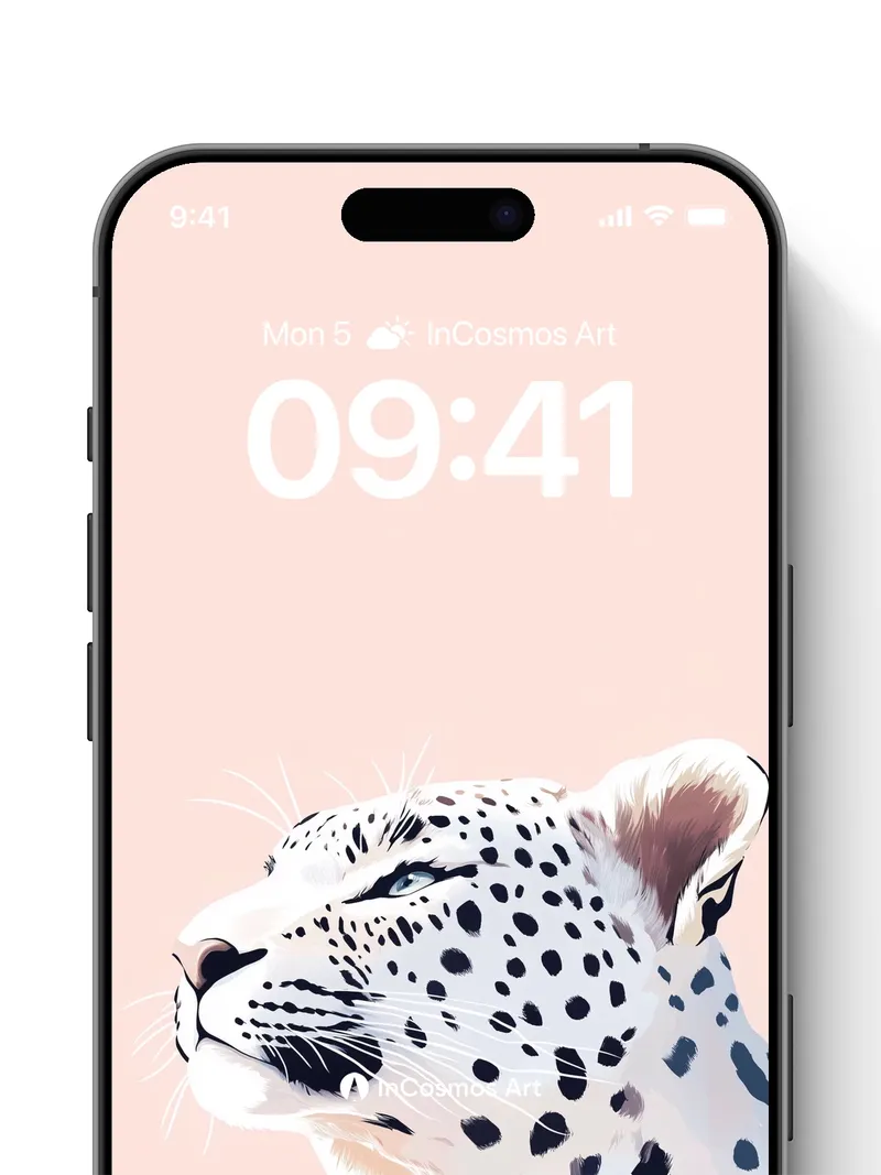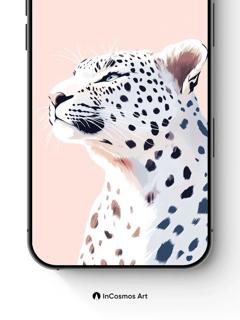 Debug page_description: Did you know snow leopards can survive in temperatures as low as -40°C, their thick fur and broad paws adapting to mountain life? This image captures the quiet strength of a white leopard, its spotted coat like constellations against a soft peach sky, eyes half-lidded in contemplation. Light drapes over its fur like silk, each black dot a whisper of wildness, while the stillness breathes calm into every curve of its profile. Share this with your best friend. Send this to your love and swap a matching set. What if silence could speak in spots?