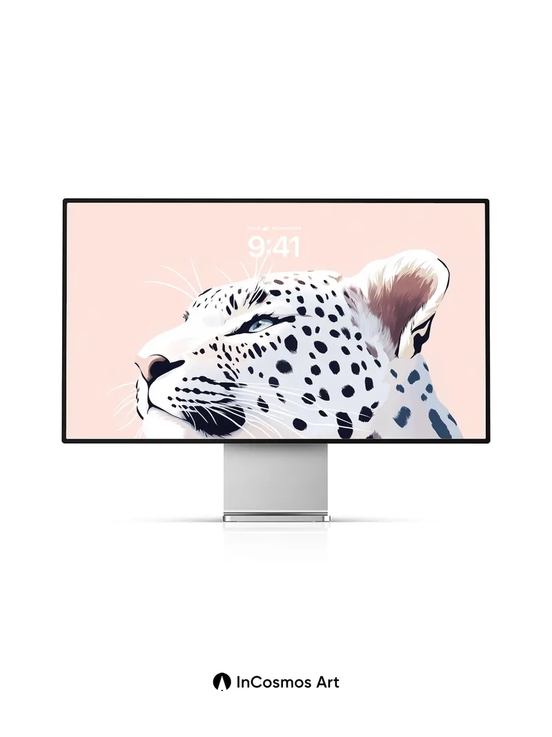 Debug product.metafields.custom.desc: Did you know snow leopards can survive in temperatures as low as -40°C, their thick fur and broad paws adapting to mountain life? This image captures the quiet strength of a white leopard, its spotted coat like constellations against a soft peach sky, eyes half-lidded in contemplation. Light drapes over its fur like silk, each black dot a whisper of wildness, while the stillness breathes calm into every curve of its profile.