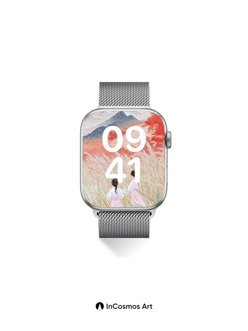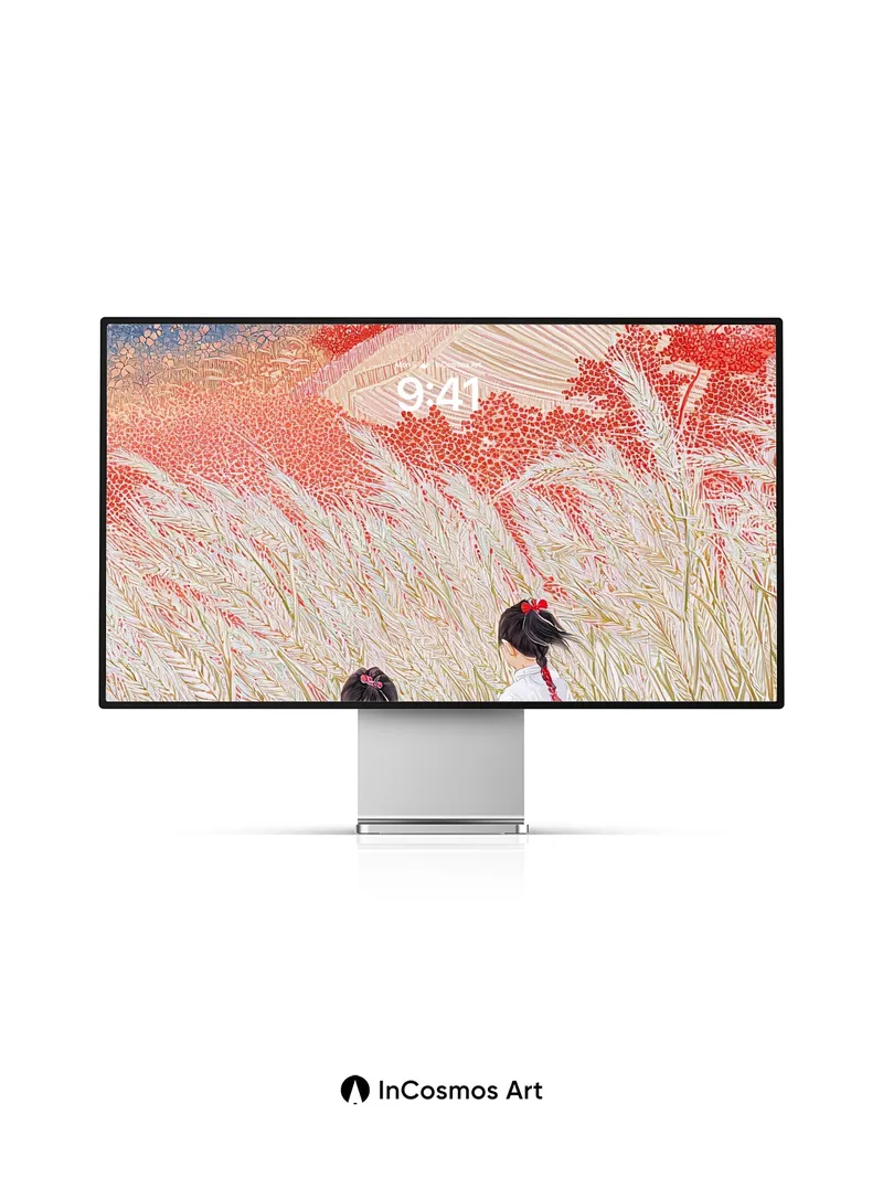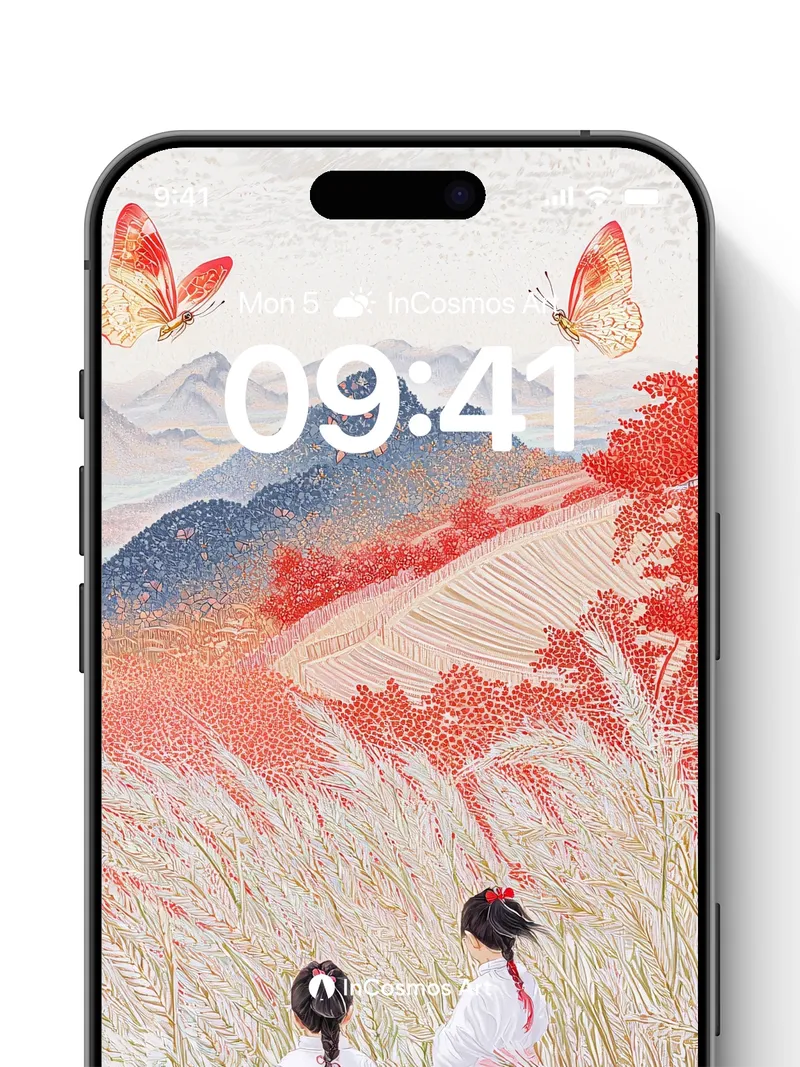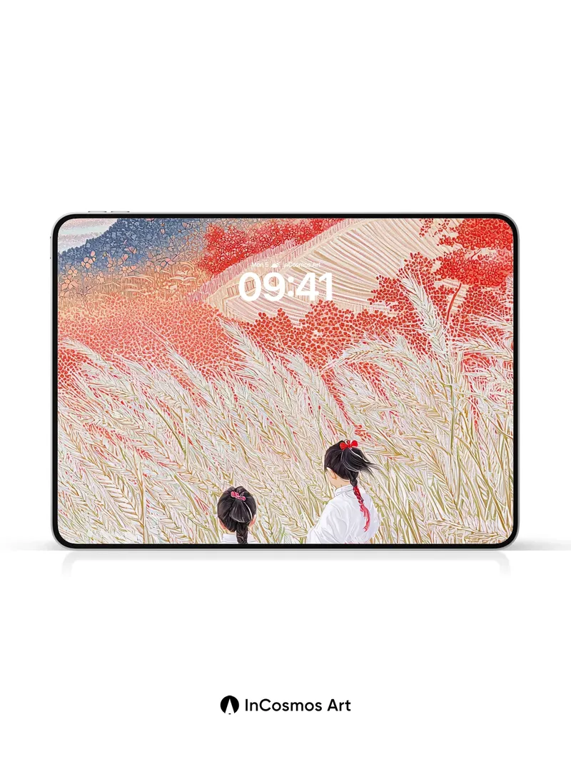 Debug product.metafields.custom.desc: Did you know that ancient Chinese poets wrote of autumn wheat fields as golden rivers flowing toward distant mountains? Here, two girls walk through a sea of tall grass where light crawls over each blade like a whisper, while crimson butterflies hover above—color breathing through the air. The landscape folds into misty peaks, painted in soft gradients that blur the line between earth and dream.