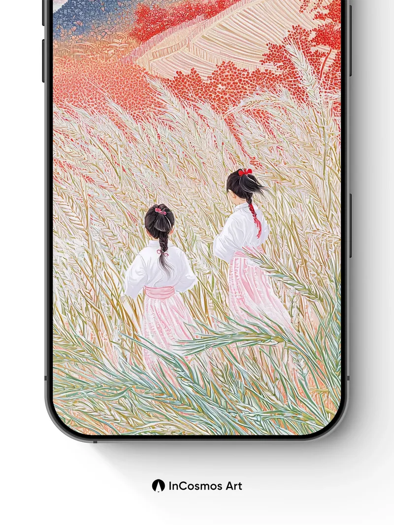 Did you know that ancient Chinese poets wrote of autumn wheat fields as golden rivers flowing toward distant mountains? Here, two girls walk through a sea of tall grass where light crawls over each blade like a whisper, while crimson butterflies hover above—color breathing through the air. The landscape folds into misty peaks, painted in soft gradients that blur the line between earth and dream.