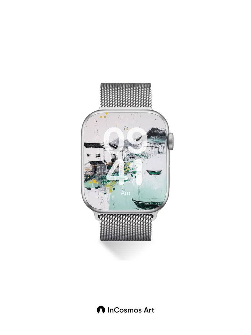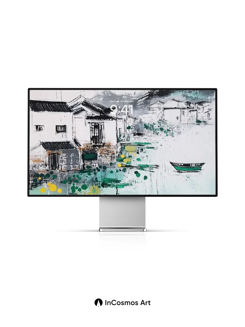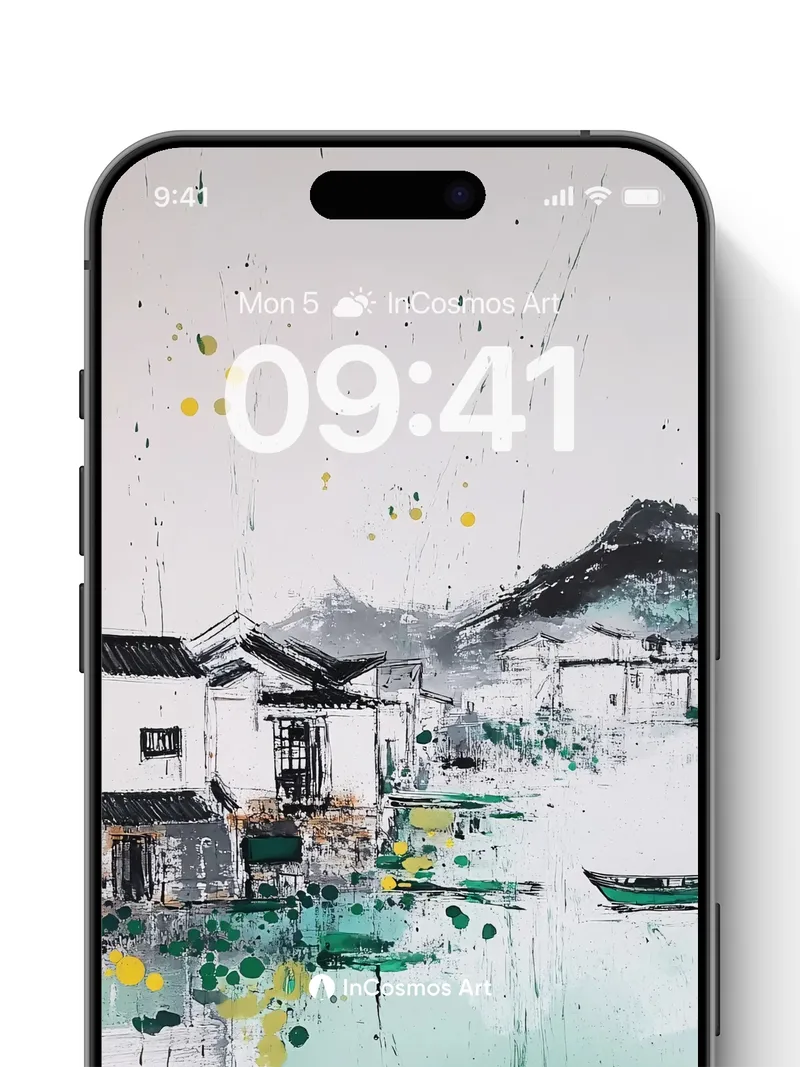 Debug product.metafields.custom.desc: Did you know traditional Chinese ink wash paintings used water to create ethereal gradients that mimic mist over still water? Here, the brushstrokes breathe life into quiet riverside homes, where green boats float like dreams on a turquoise mirror. The yellow dots—like distant lanterns or falling leaves—dissolve into the haze, and the mountain looms softly in the distance, painted with the weight of silence.