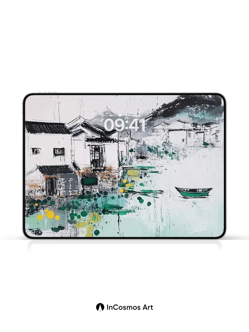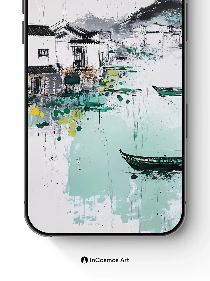 Did you know traditional Chinese ink wash paintings used water to create ethereal gradients that mimic mist over still water? Here, the brushstrokes breathe life into quiet riverside homes, where green boats float like dreams on a turquoise mirror. The yellow dots—like distant lanterns or falling leaves—dissolve into the haze, and the mountain looms softly in the distance, painted with the weight of silence.