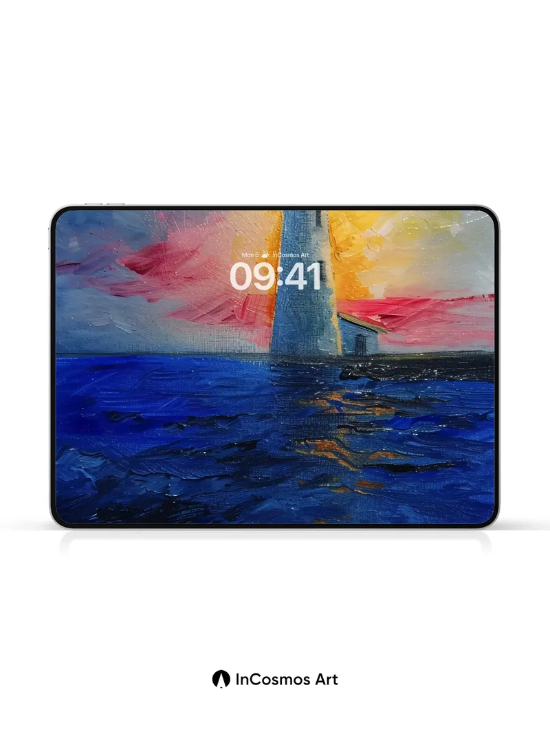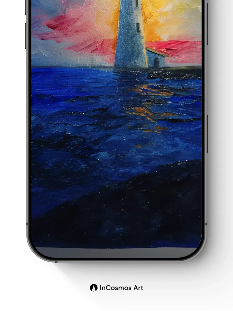Debug page_description: Did you know lighthouses once used kerosene lamps that cast a warm, flickering light across storm-tossed seas? Here, the beacon pulses like a heartbeat, its golden glow bleeding into swirling clouds of rose and amber above a sea painted in deep cobalt waves. The brushstrokes thicken near the waterline, where texture mimics the rhythm of tide and time—each stroke a memory of salt on skin and wind in hair. Share this with your best friend. Send this to your love and swap a matching set. What if every wave carried a secret from the shore?