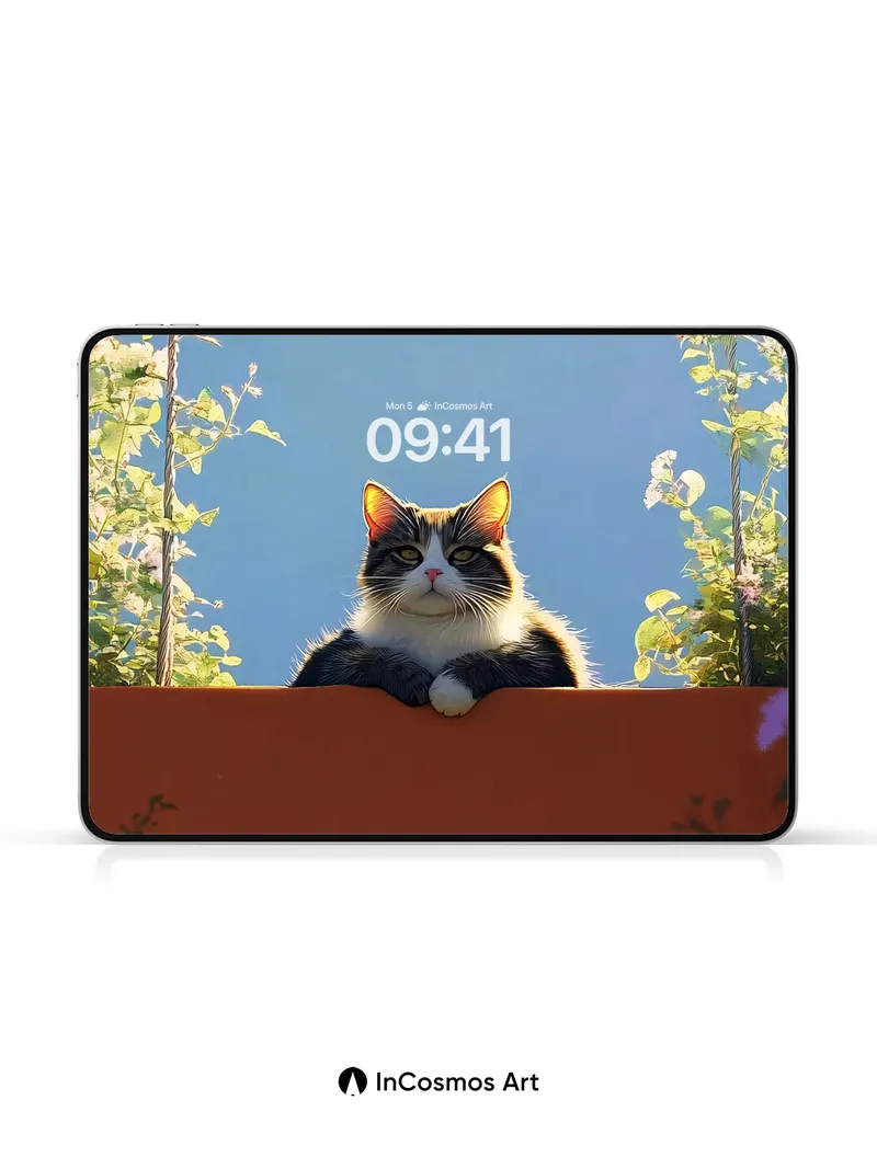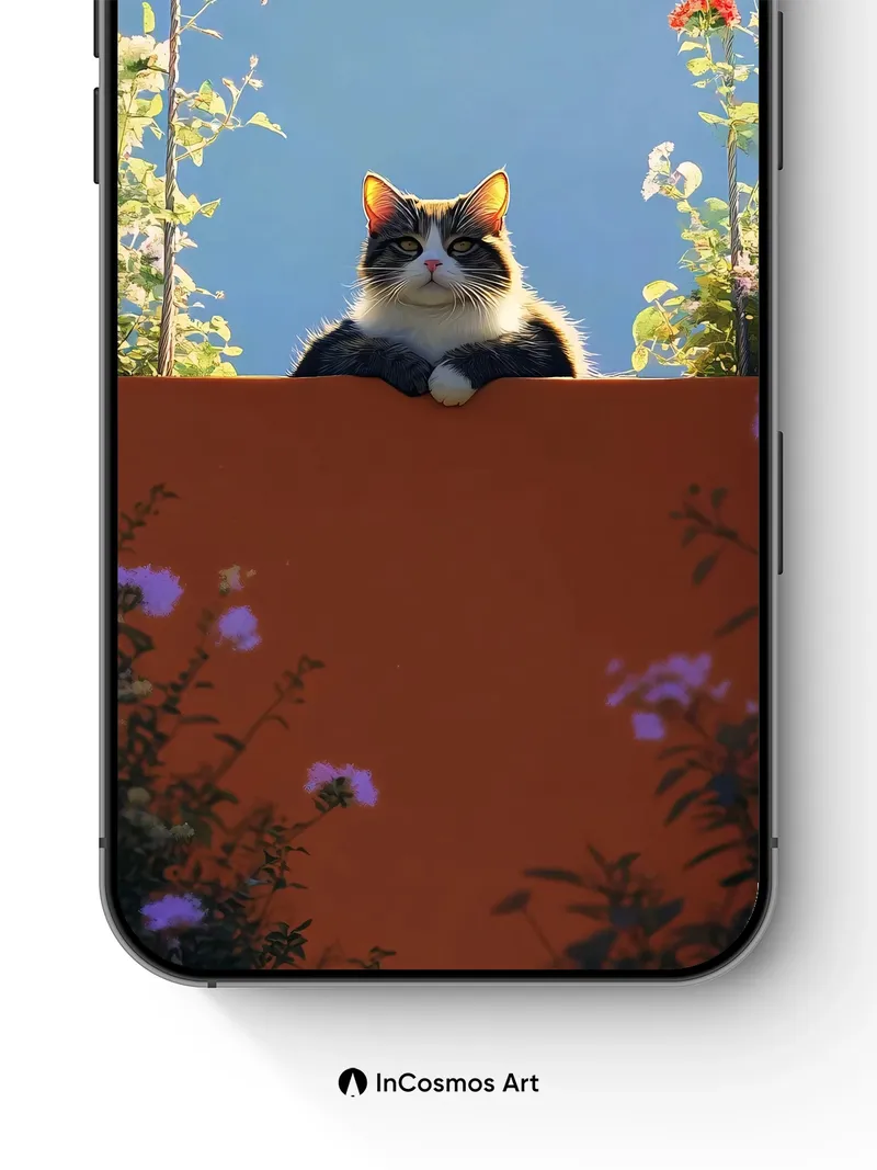 Debug product.metafields.custom.desc: Did you know cats can detect subtle shifts in light that humans miss? This moment captures the quiet authority of a tuxedo cat perched above terracotta, framed by climbing flowers whose petals shimmer like stained glass under a cloudless sky. The warmth of sun-kissed stone contrasts with the cool blue void behind, creating a stillness so deep it feels like time has paused just to breathe.