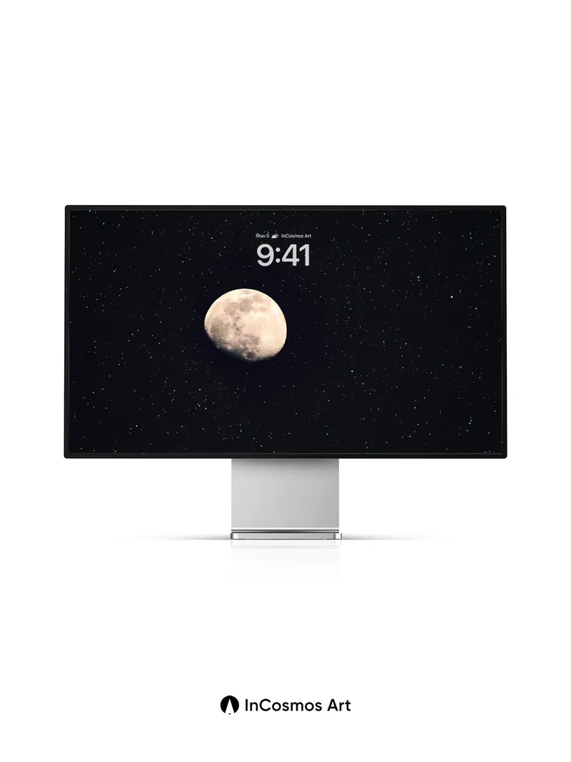Debug product.metafields.custom.desc: Did you know the Moon reflects only 12% of sunlight, yet its glow can still cast shadows on Earth? In this image, it floats like a pale marble sphere, half-lit by distant sunbeams, while thousands of stars pierce the velvet dark—each one a frozen moment in time. The surface is etched with ancient craters, and the light crawls over them slowly, as if the sky itself breathes.