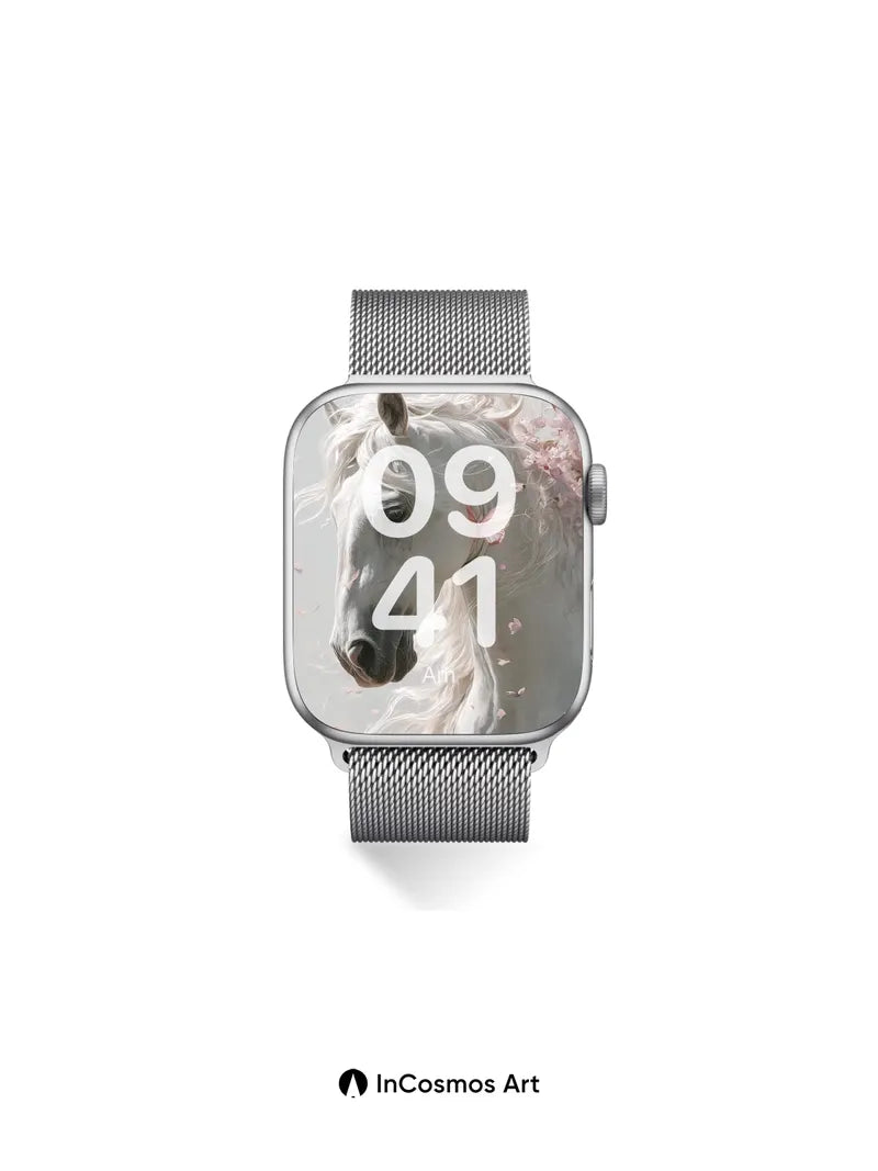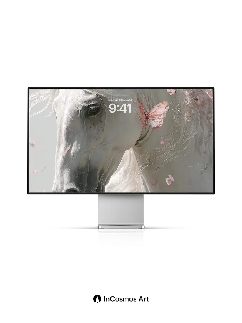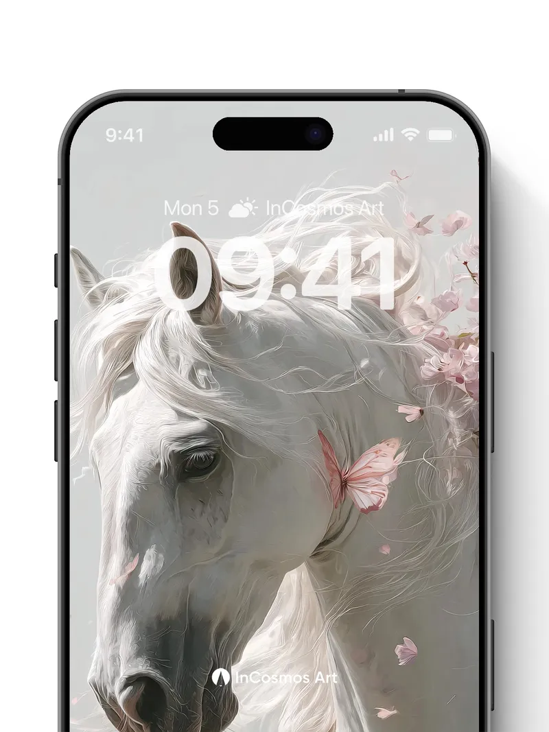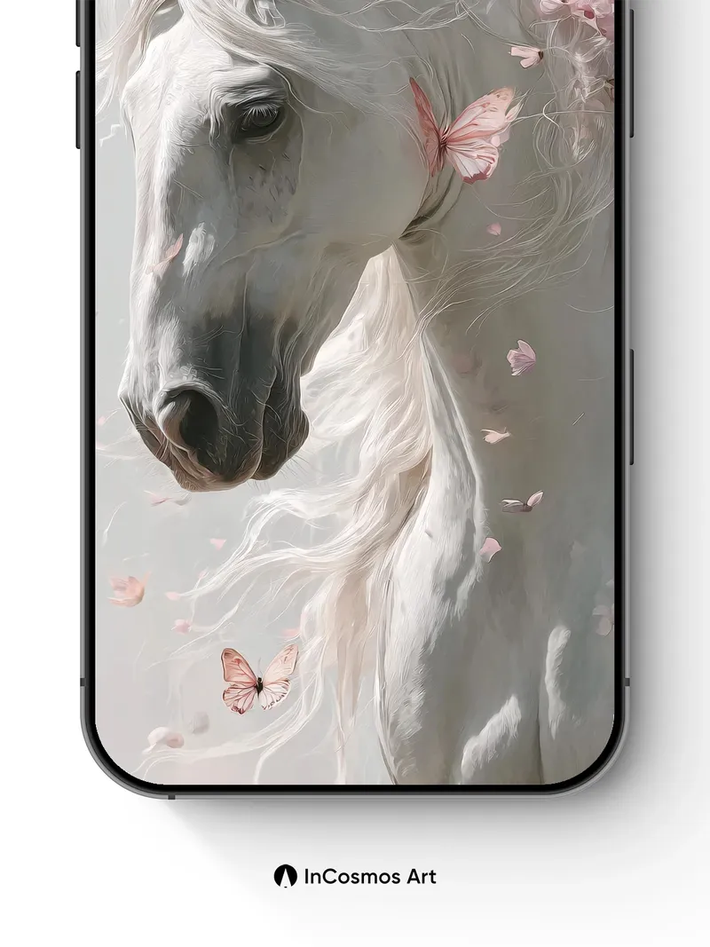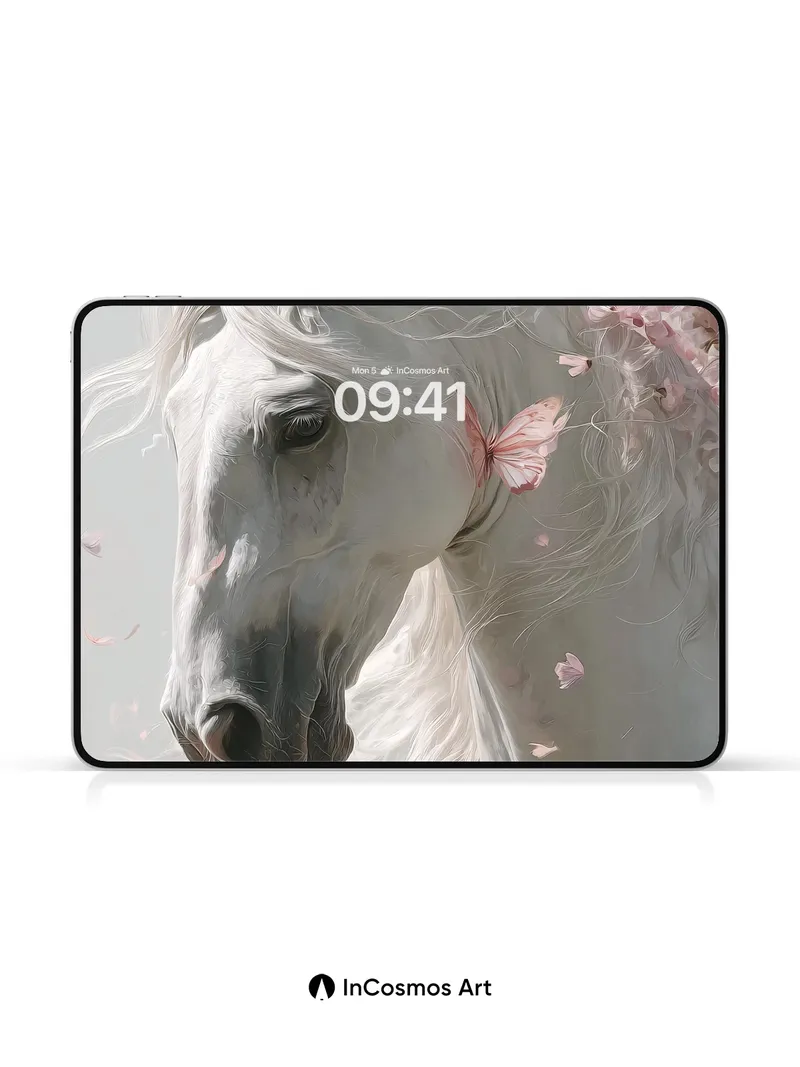 Serenity of the White Steed Wallpaper with Fluttering Petals