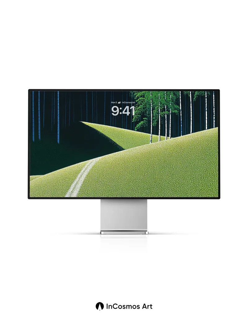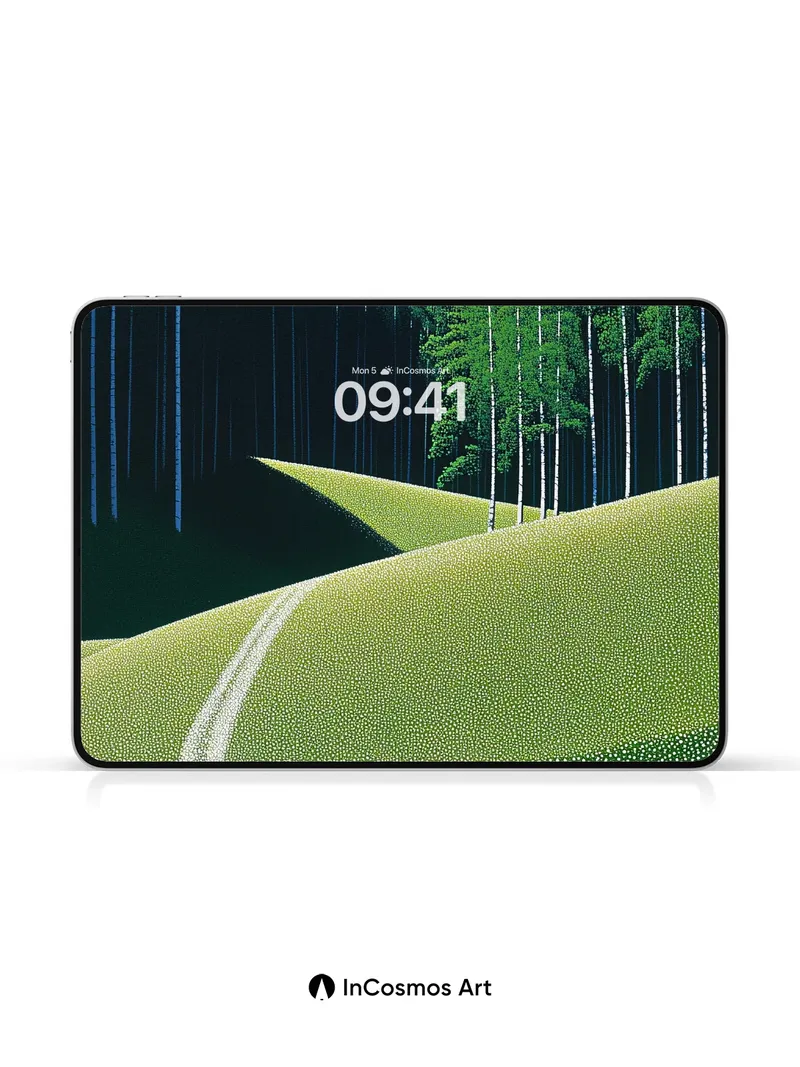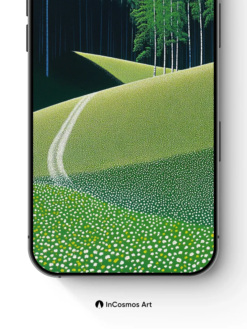 Debug product.metafields.custom.desc: Did you know that Japanese artist Yayoi Kusama once said her polka dots represent the infinite universe? Here, light crawls over a field of tiny white and yellow blooms, each dot a whisper of life under a velvet sky. The path winds like breath through rolling hills, flanked by birch trees standing tall as silent sentinels—every line drawn with precision, every shade layered like memory.