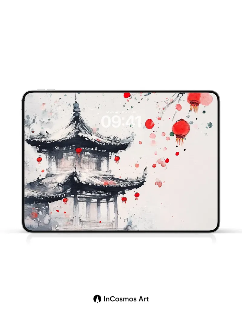 Serenity Pavilion Wallpaper with Floating Lanterns