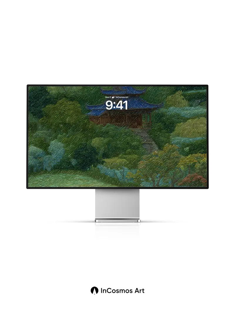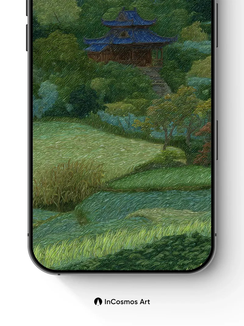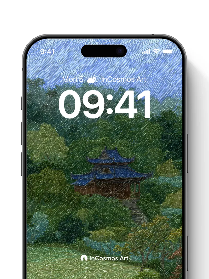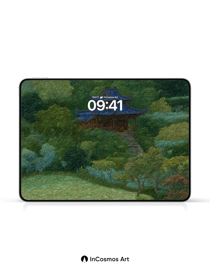 Serenity Pavilion Wallpaper with Rain-Textured Brushwork