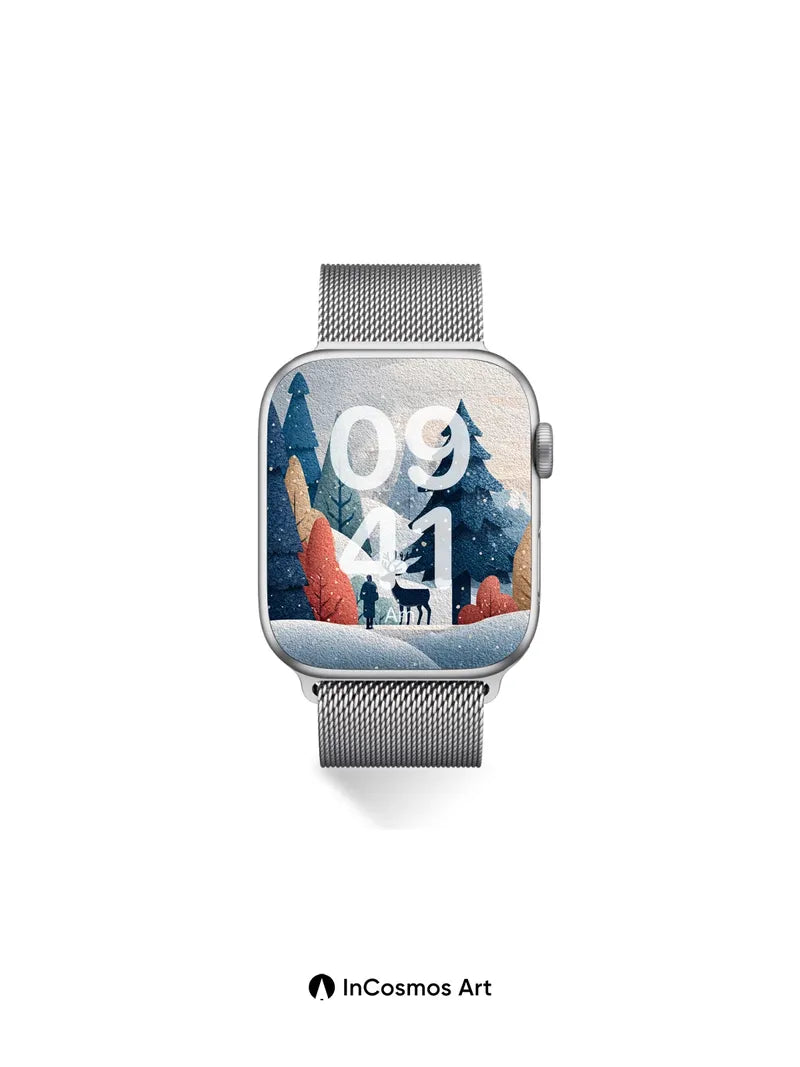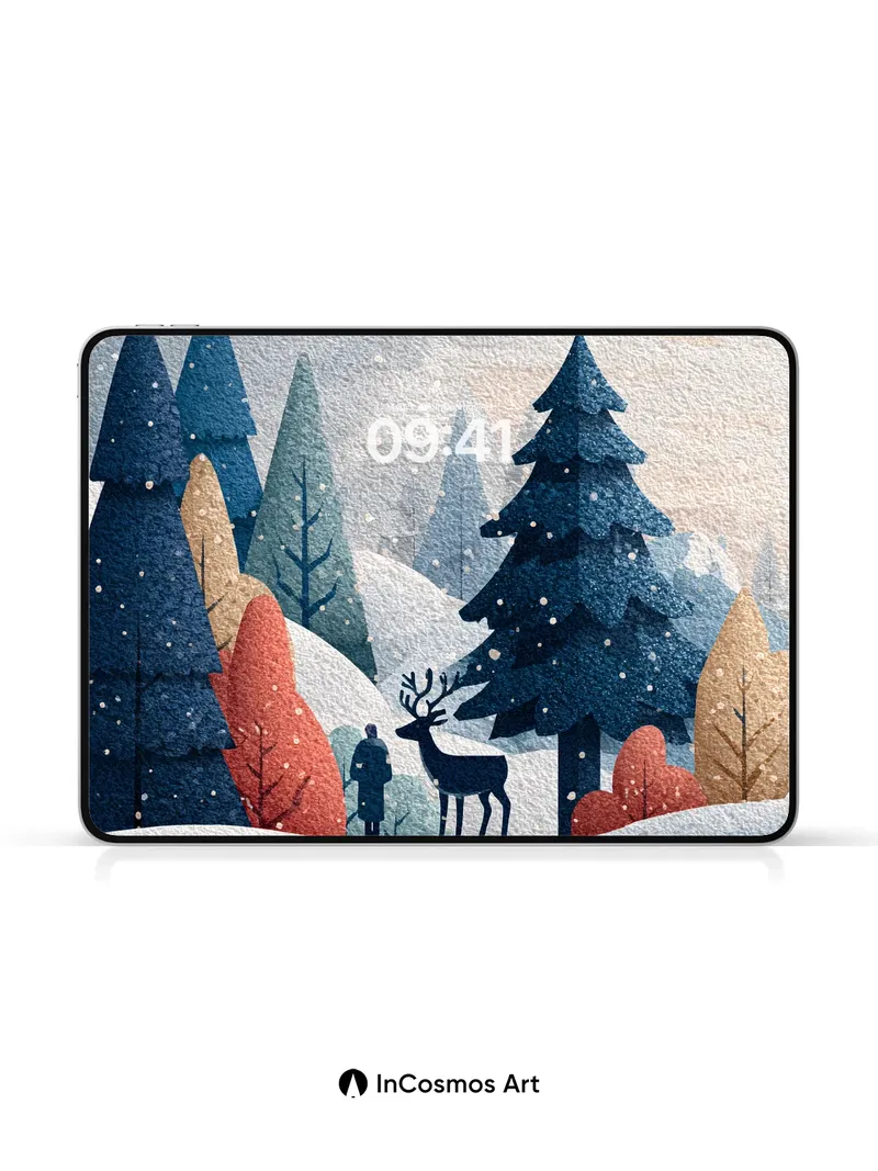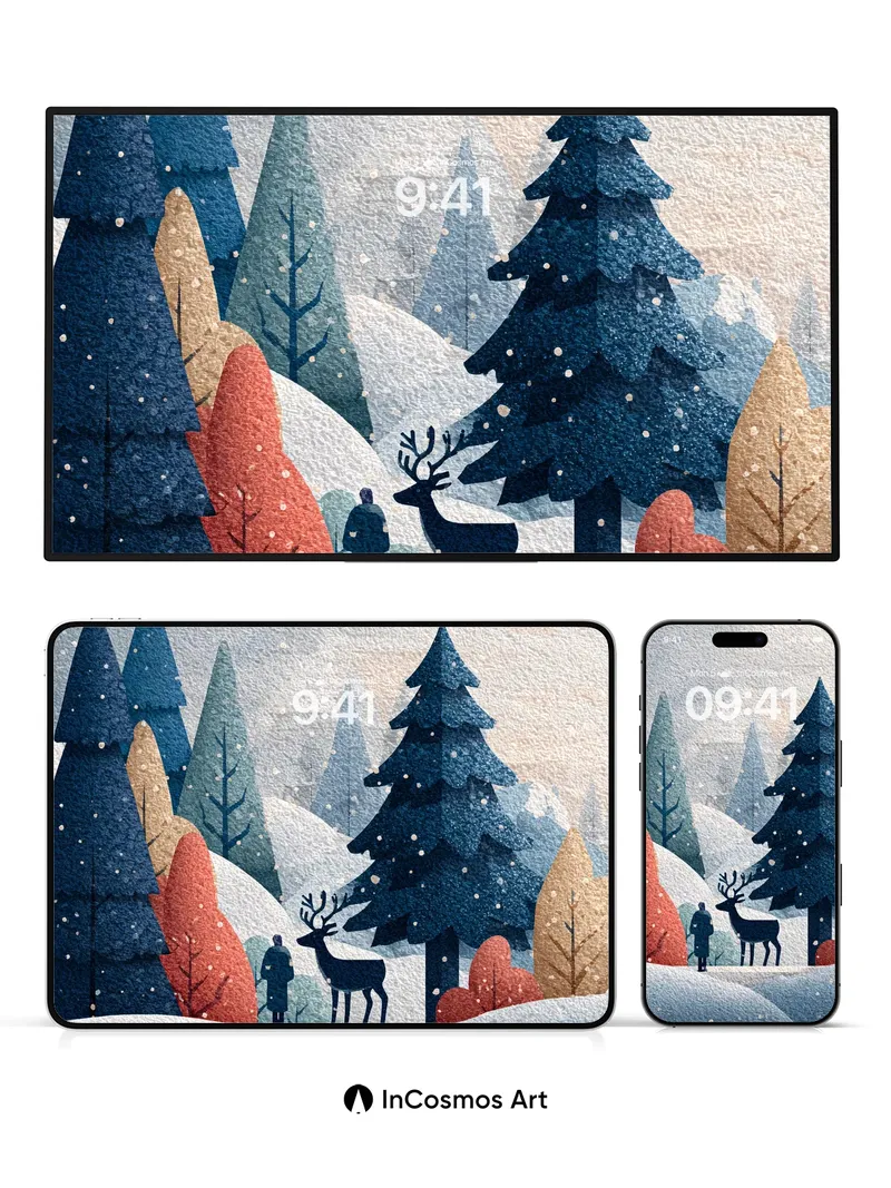 Debug product.metafields.custom.desc: Did you know snowflakes form unique hexagonal crystals as they descend, each one a tiny universe of frozen air? Here, the forest breathes in quiet blue and rusted amber, where every pine needle holds a secret frost and the wind hums through bare branches like a lullaby. A lone figure walks beside a deer, both silhouetted against the soft fall of snow, their presence gentle as breath on glass.