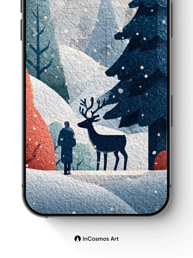 Did you know snowflakes form unique hexagonal crystals as they descend, each one a tiny universe of frozen air? Here, the forest breathes in quiet blue and rusted amber, where every pine needle holds a secret frost and the wind hums through bare branches like a lullaby. A lone figure walks beside a deer, both silhouetted against the soft fall of snow, their presence gentle as breath on glass.