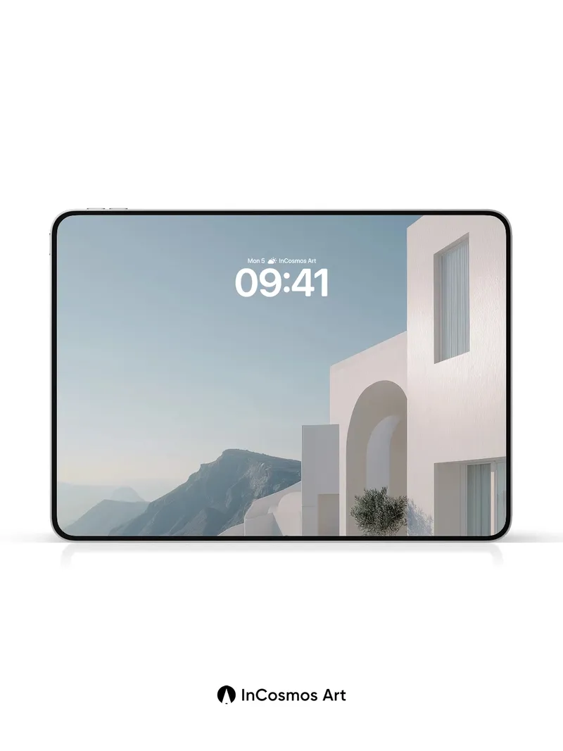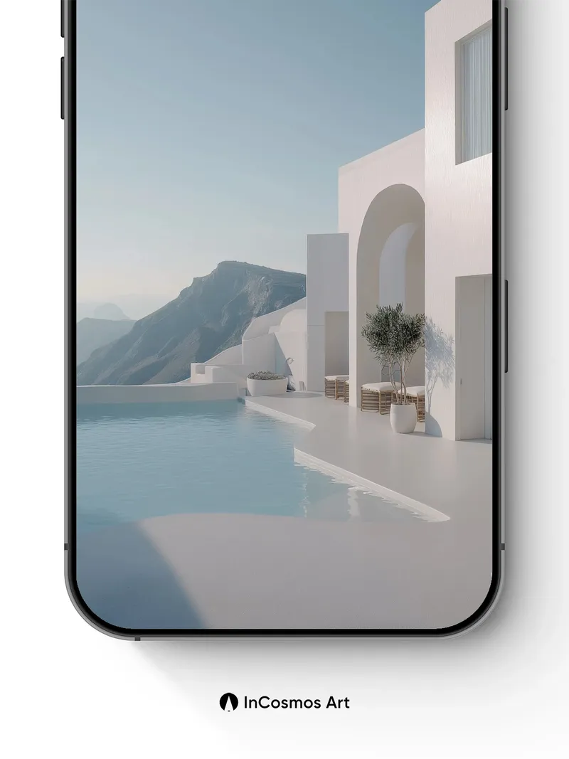 Debug product.metafields.custom.desc: Did you know the Greeks built their homes to catch the afternoon sun like liquid silver? Here, light crawls over white plaster walls, pooling in quiet corners and dancing across the still surface of a glass-like infinity pool. The distant mountains breathe in soft haze, while an olive tree stands sentinel under the archway—its shadow a whisper against the clean lines of modern architecture.