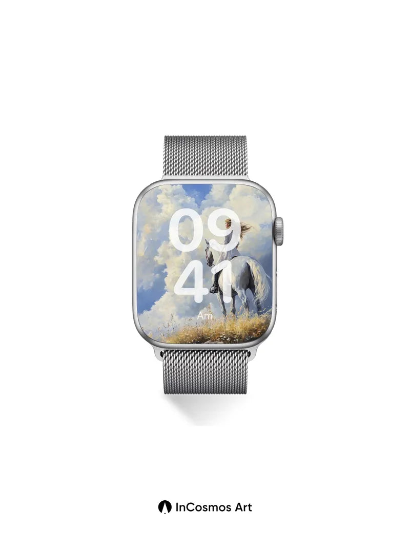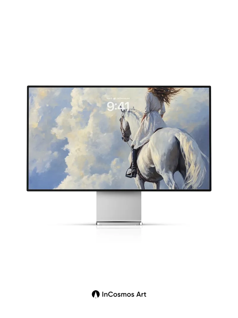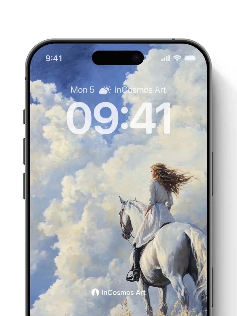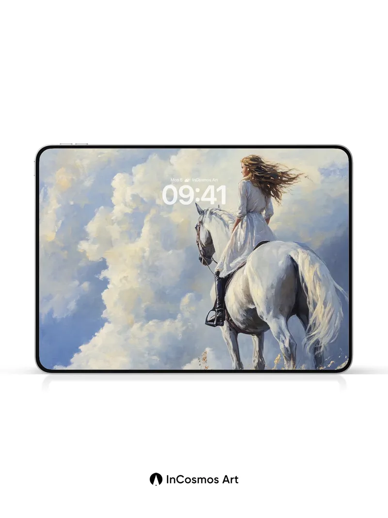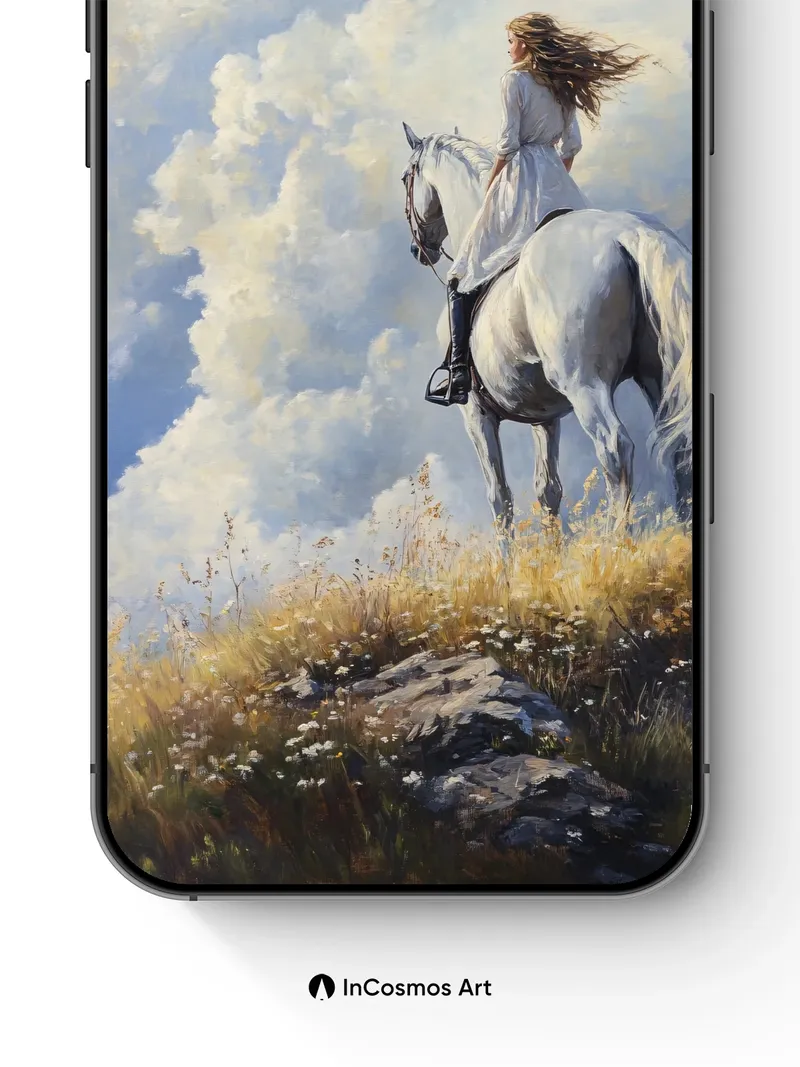 Debug product.metafields.custom.desc: Did you know that the softest light in nature often appears at dawn and dusk, when shadows stretch like whispers across the land? Here, a rider in flowing linen moves with the wind, her hair a golden thread against an immense sky where clouds bloom like cottonwood fluff. The horse’s coat gleams as if brushed by moonlight, standing still on a hillside carpeted with wildflowers and sun-warmed stone.