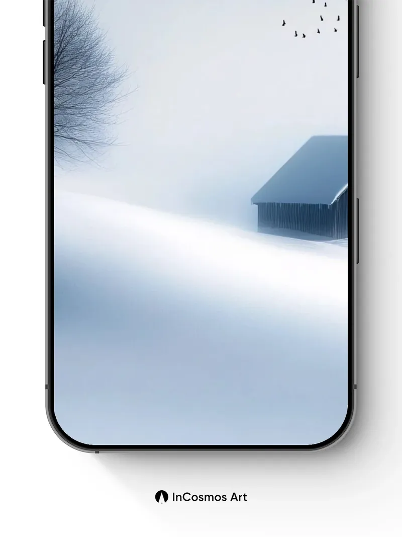 Did you know snowflakes form unique crystalline structures in mid-air before settling? Here, each flake rests like a frozen breath on the hillside, where light crawls over untouched powder and a lone tree stands bare beneath a sky of hushed blue. A cabin sleeps under a roof of ice, while geese carve invisible lines across the vastness—time slows, and stillness becomes a language.