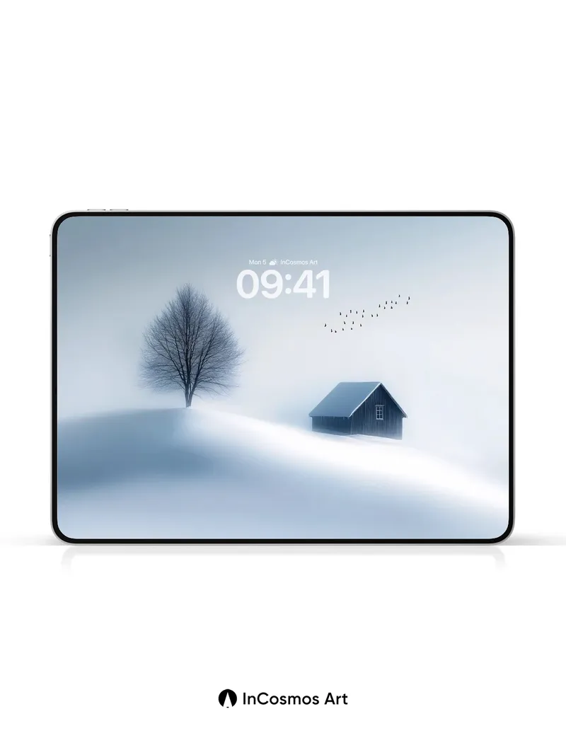 Debug page_description: Did you know snowflakes form unique crystalline structures in mid-air before settling? Here, each flake rests like a frozen breath on the hillside, where light crawls over untouched powder and a lone tree stands bare beneath a sky of hushed blue. A cabin sleeps under a roof of ice, while geese carve invisible lines across the vastness—time slows, and stillness becomes a language. Share this with your best friend. Send this to your love and swap a matching set. What if silence could be heard?